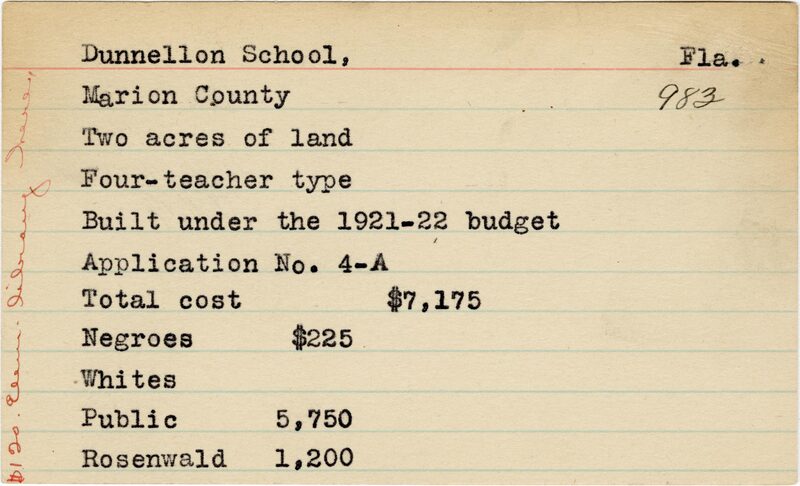 - School card from the Rosenwald Fund for Dunnellon School in Marion County, Florida with a handwritten note on the far left that says, "$120 elem. Library here"