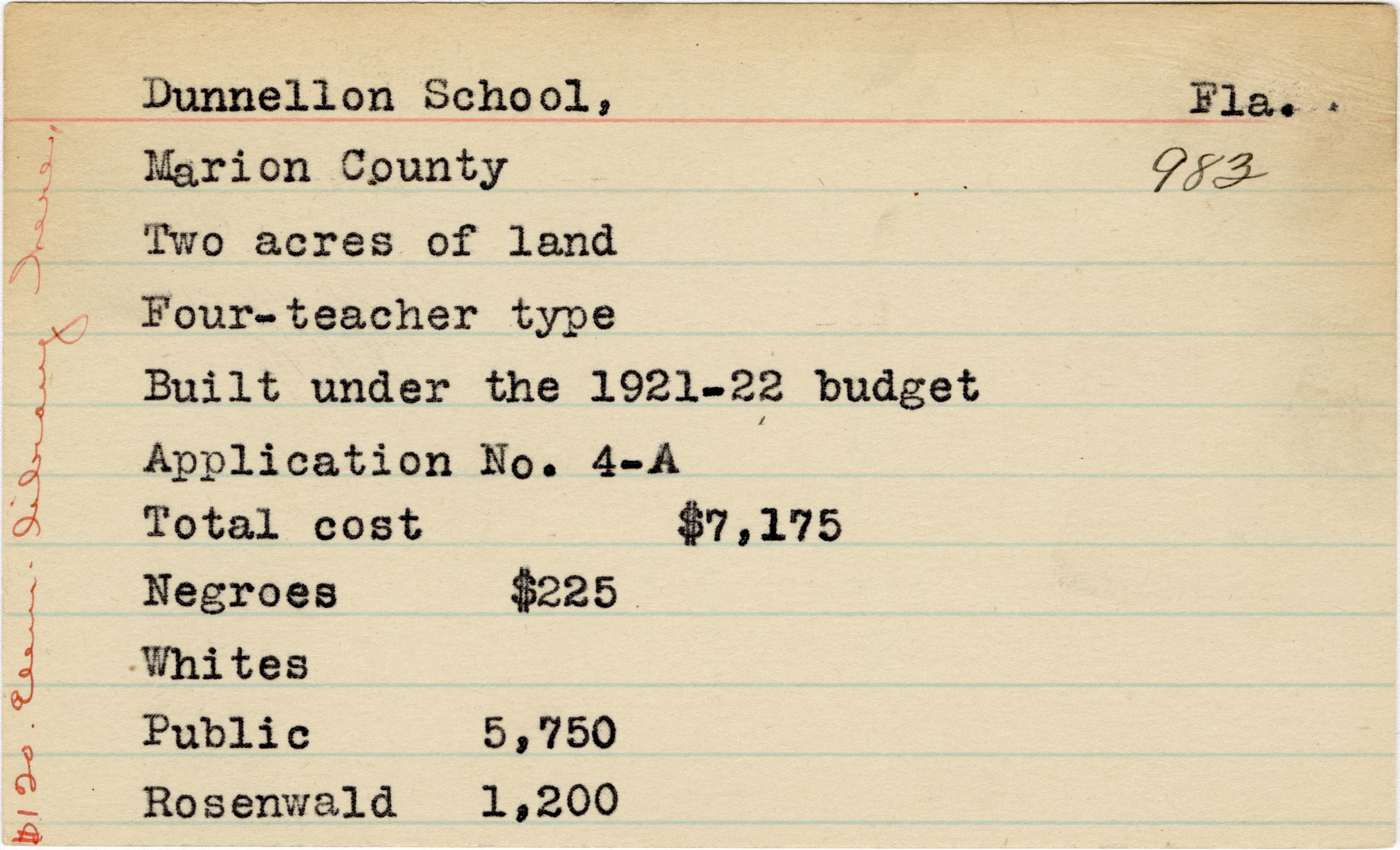 School card from the Rosenwald Fund for Dunnellon School in Marion County, Florida with a handwritten note on the far left that says, "$120 elem. Library here"