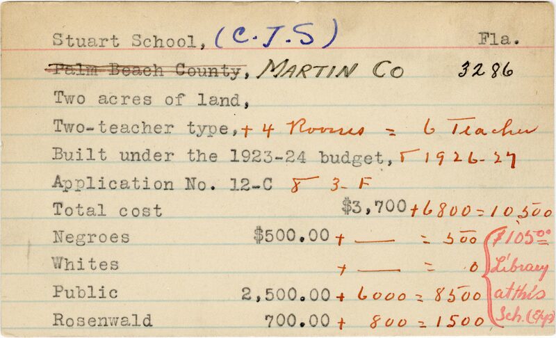 - School card from the Rosenwald Fund for Stuart School in Martin County, Florida with handwritten additions to the teacher type, budget year, application number, and budget contribution sections.