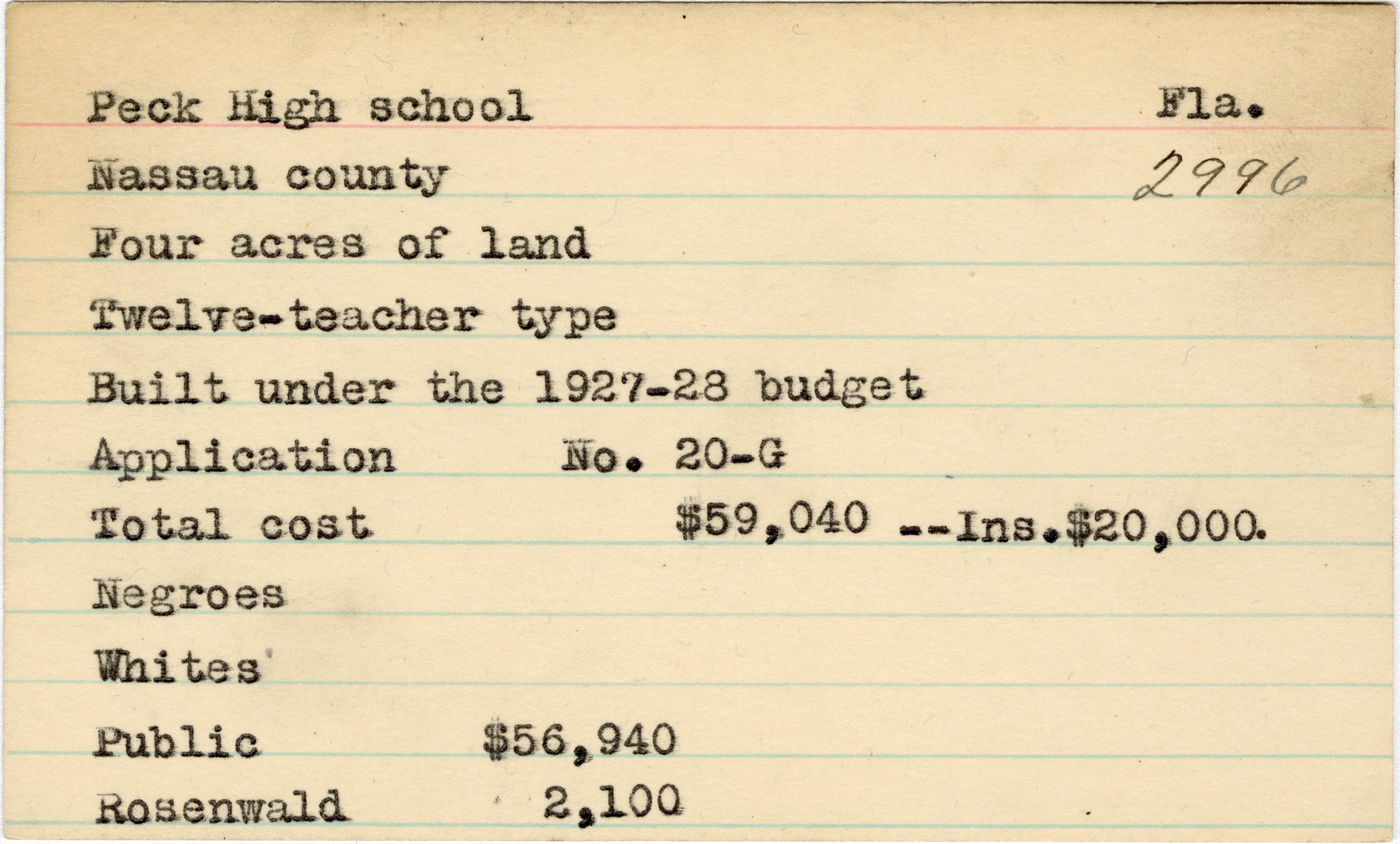 School card from the Rosenwald Fund for Peck High School in Nassau County, Florida with a section added to the budget contributions that says, "Ins. $20,000".