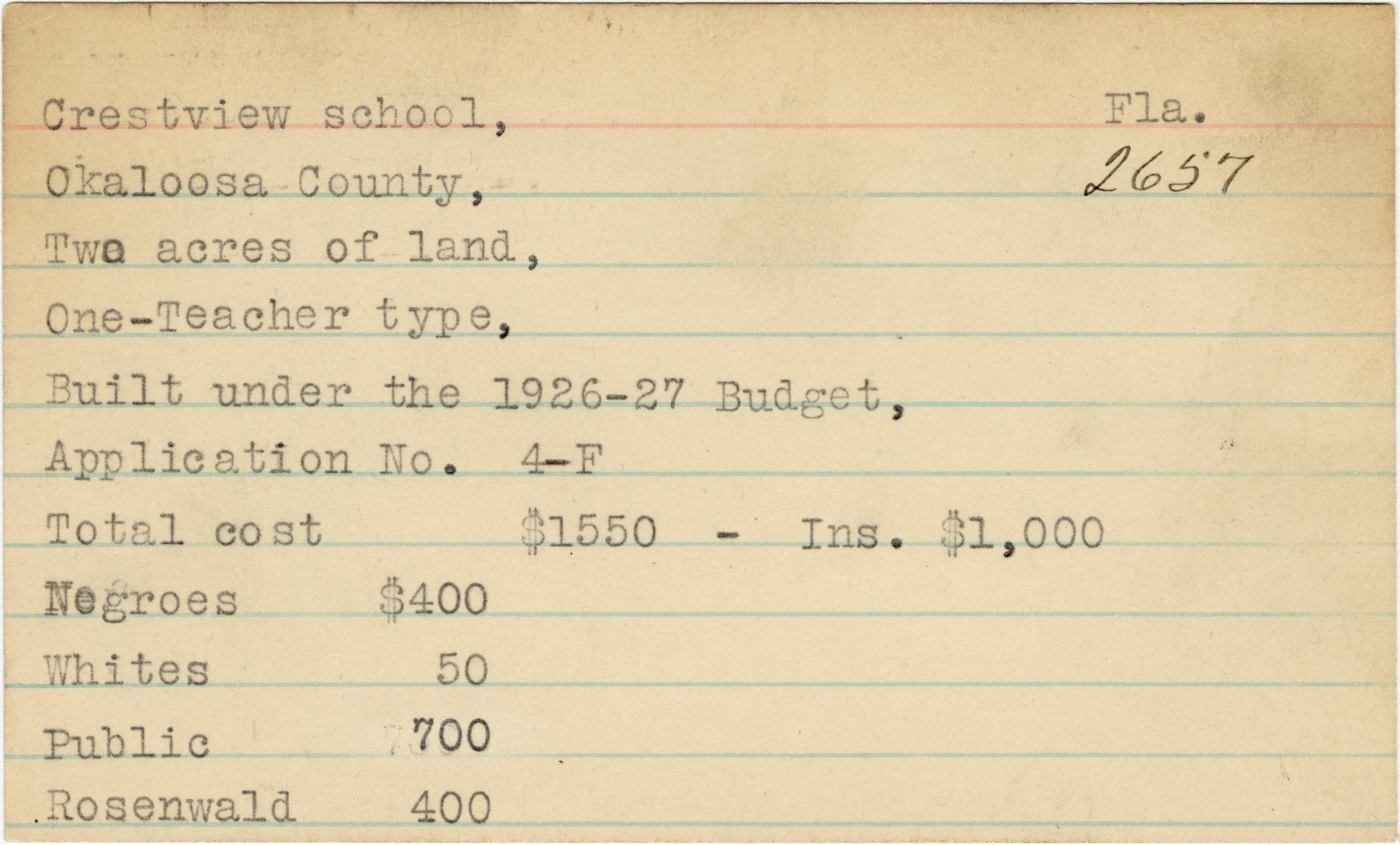School card from the Rosenwald Fund for Crestview School in Okaloosa County, Florida with a section added to the budget contributions that says, "Ins. $1,000".