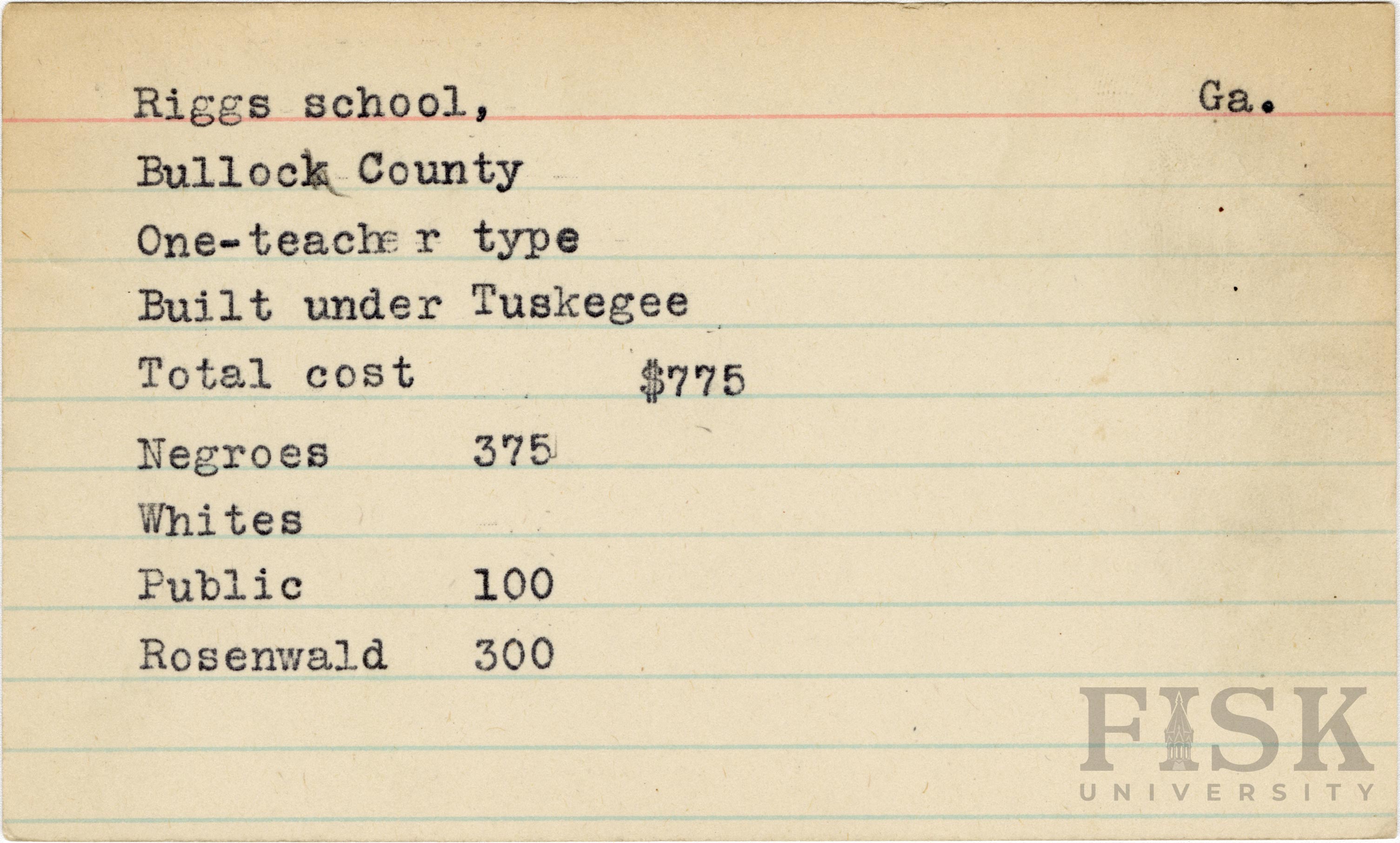 - School card from Rosenwald Fund for Riggs School in Bulloch County, Georgia