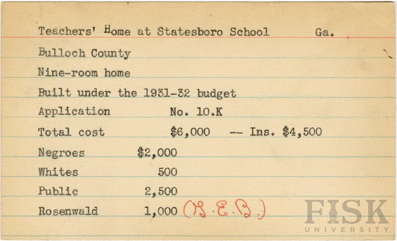 - School card from Rosenwald Fund for teacher's home in Statesboro School in Bulloch County, Georgia with a section added to the budget contributions that says, "Ins. $4,500" and "(G.E.B.)" next to the Rosenwald budget contribution