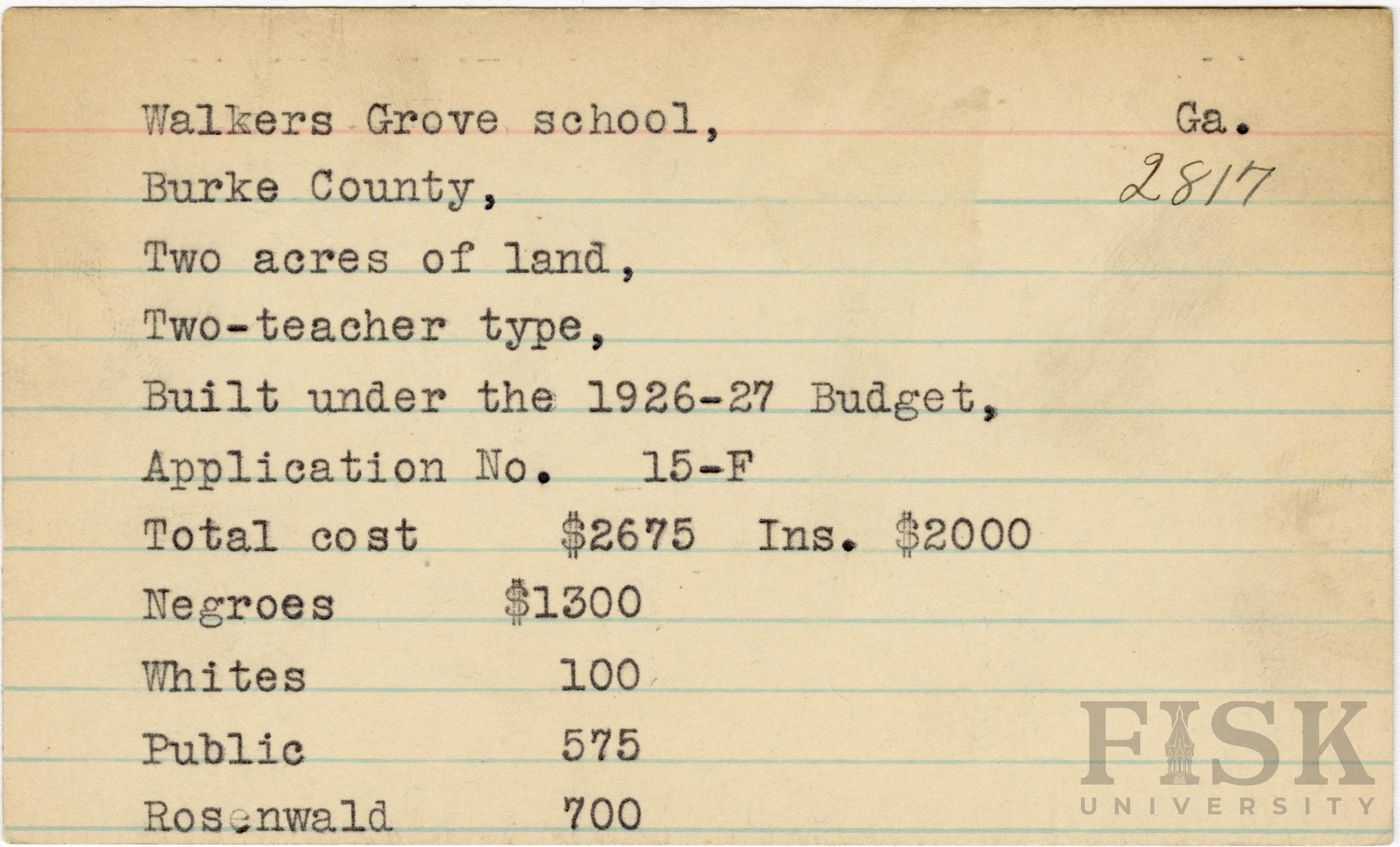 - School card from Rosenwald Fund for Walkers Grove School in Burke County, Georgia with a section added to the budget contributions that says, "Ins. $2,000"