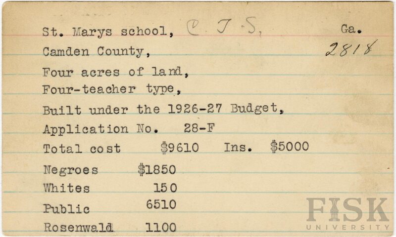 - School card from Rosenwald Fund for St. Marys School in Camden County, Georgia with a section added to the budget contributions that says, "Ins. $5,000"