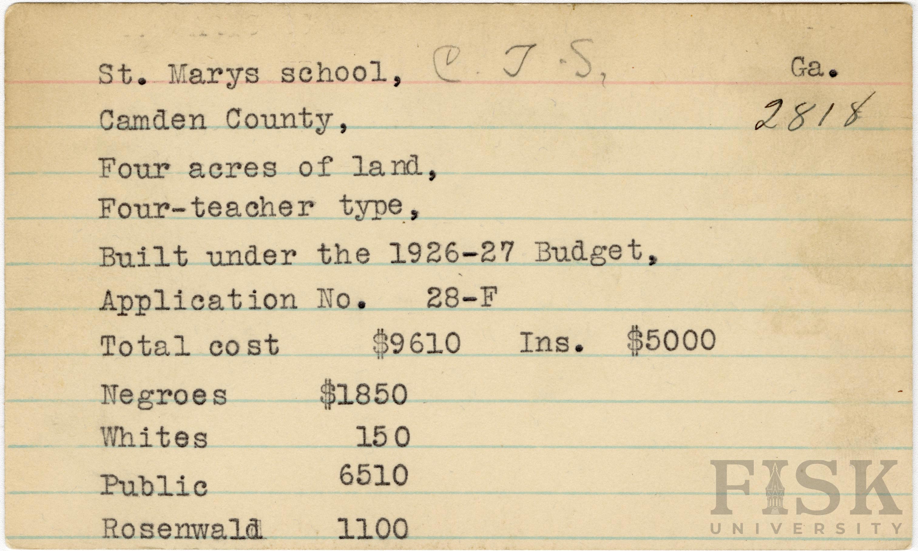 School card from Rosenwald Fund for St. Marys School in Camden County, Georgia with a section added to the budget contributions that says, "Ins. $5,000"