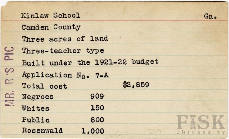 - School card from Rosenwald Fund for Kinlaw School in Camden County, Georgia with a note on the far left that say, "Mr. R's Pic"