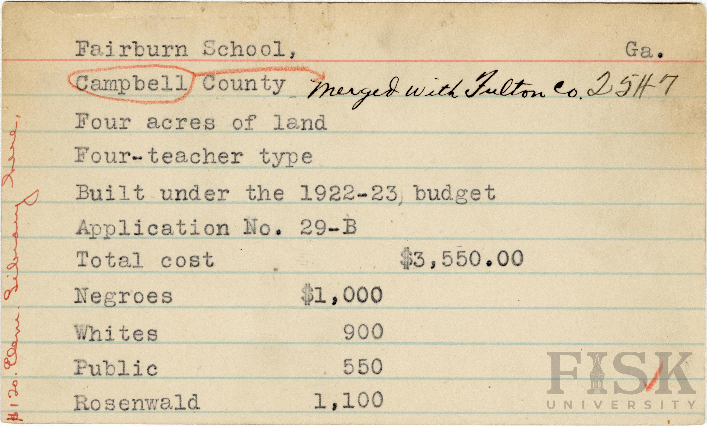 - School card from Rosenwald Fund for Fairburn School in Campbell County, Georgia with a note next to the county name that says, "merged with Fulton Co." and a handwritten note on the far left that says, "$120 elem library here"