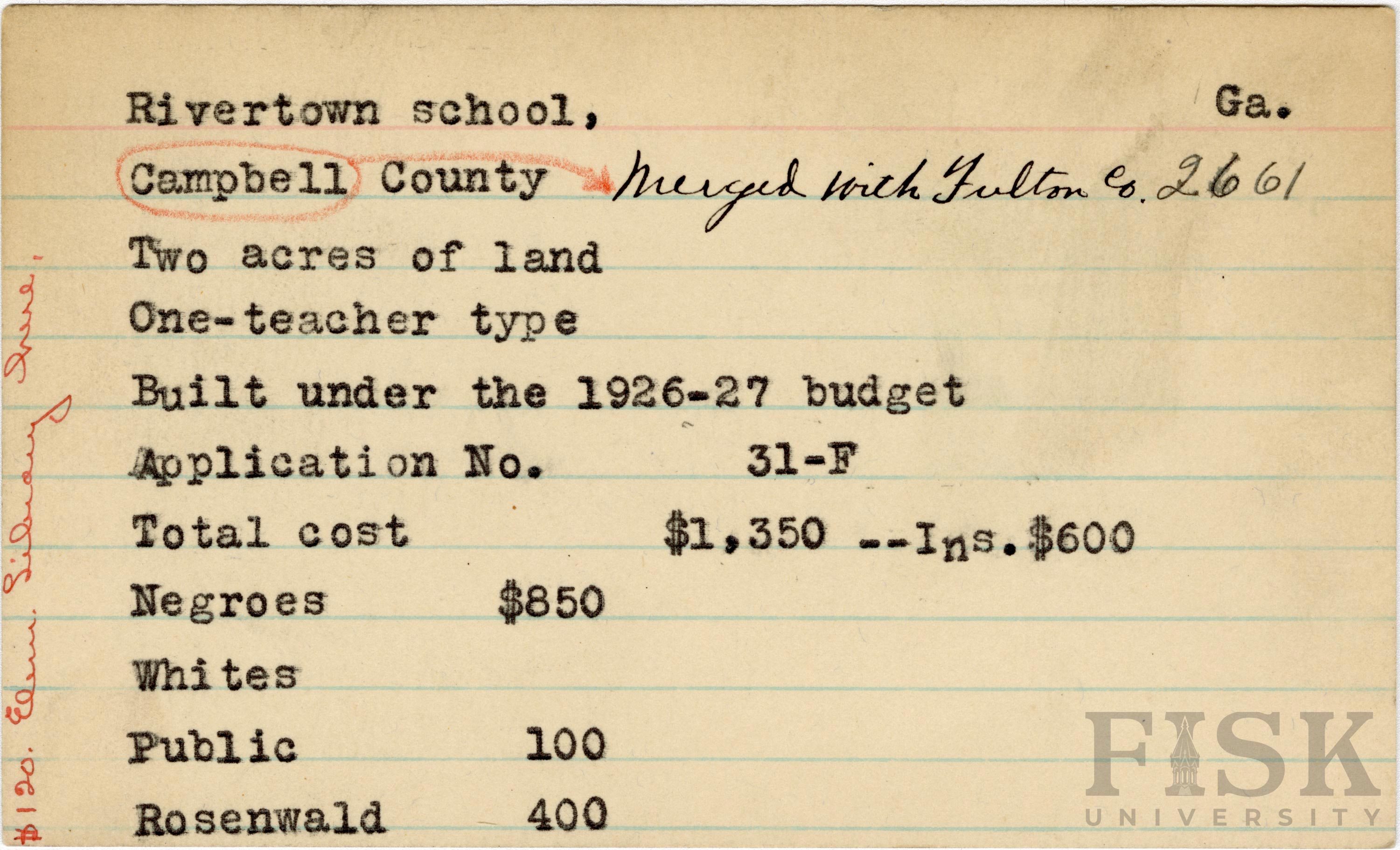 - School card from Rosenwald Fund for Rivertown School in Campbell County, Georgia with a section added to the budget contributions that says, "Ins. $600". One handwritten note next to the county name says, "Merged with Fulton Co." and another handwritten says, "$120 elem library here"