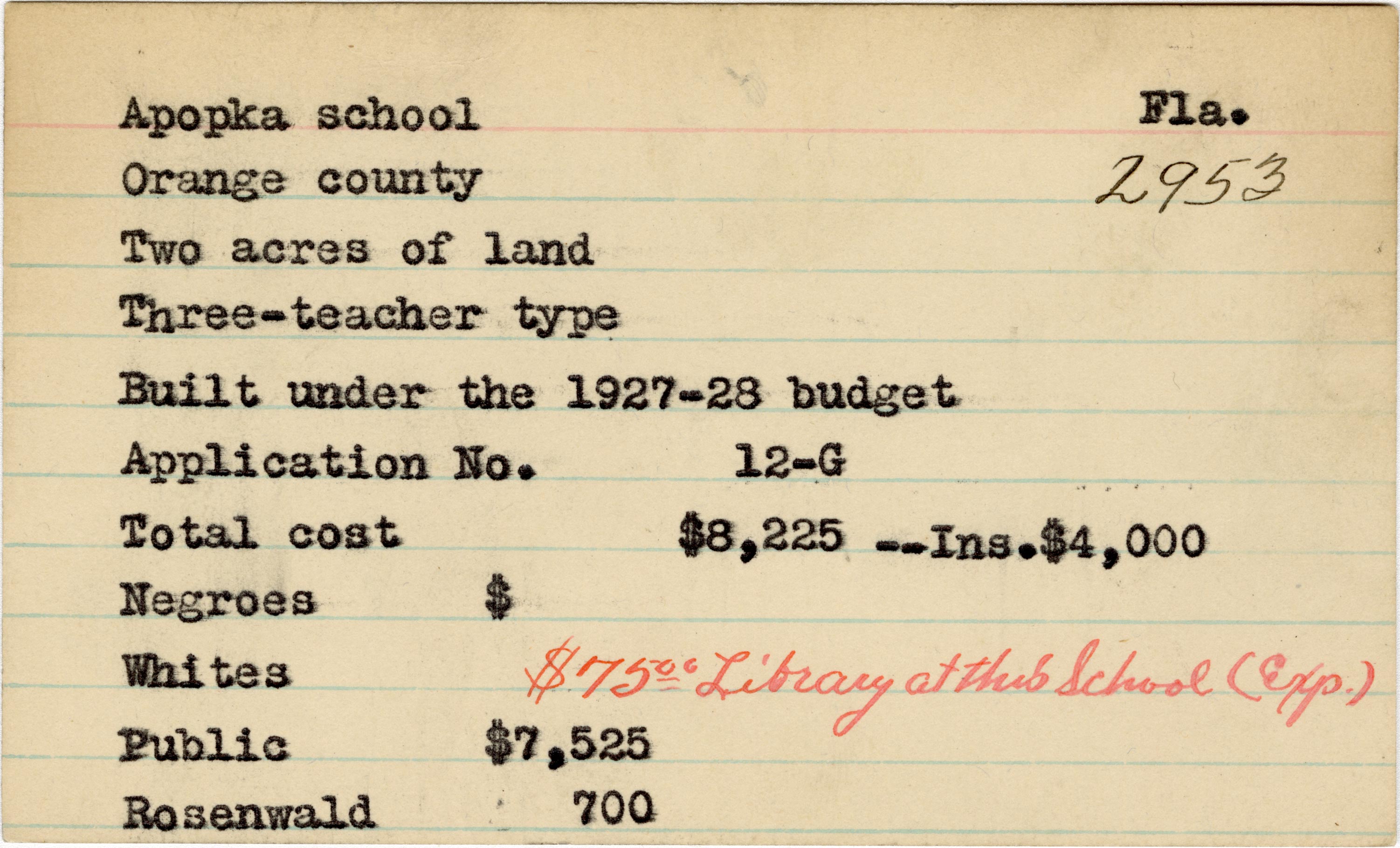 School card from the Rosenwald Fund for Apopka School in Orange County, Florida with a section added to the budget contributions that says, "Ins. $4,000" and a handwritten note that says, "$75.00 library at this school (Exp.)".