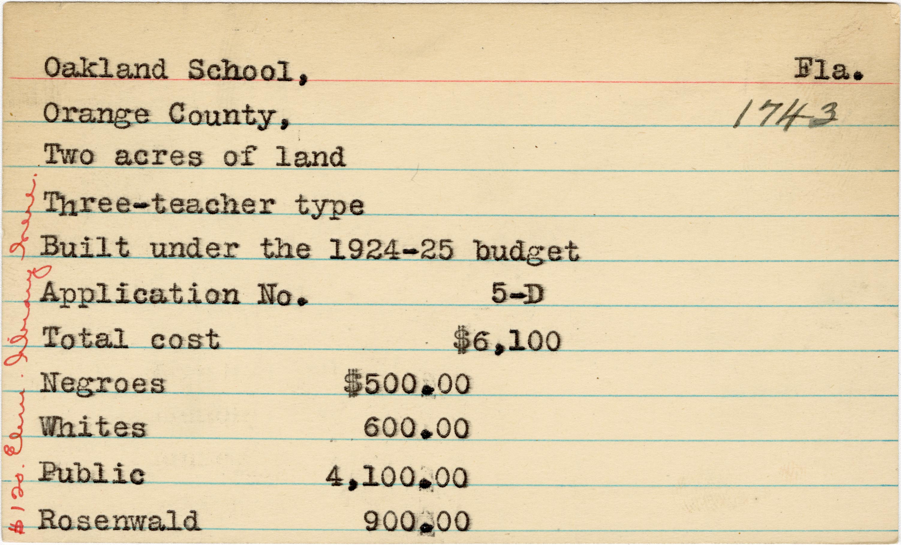 - School card from the Rosenwald Fund for Oakland School in Orange County, Florida with a handwritten note on the far left of the card that says, "$120 elem library here".