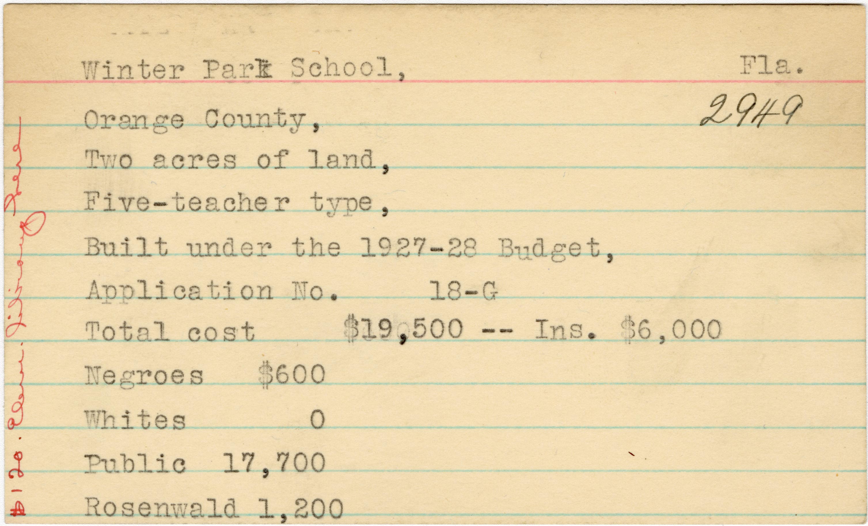 School card from the Rosenwald Fund for Winter Park School in Orange County, Florida with a section added to the budget contributions that says, "Ins. $6,000" and a handwritten note on the far left of the card that says, "$120 elem. Library here".