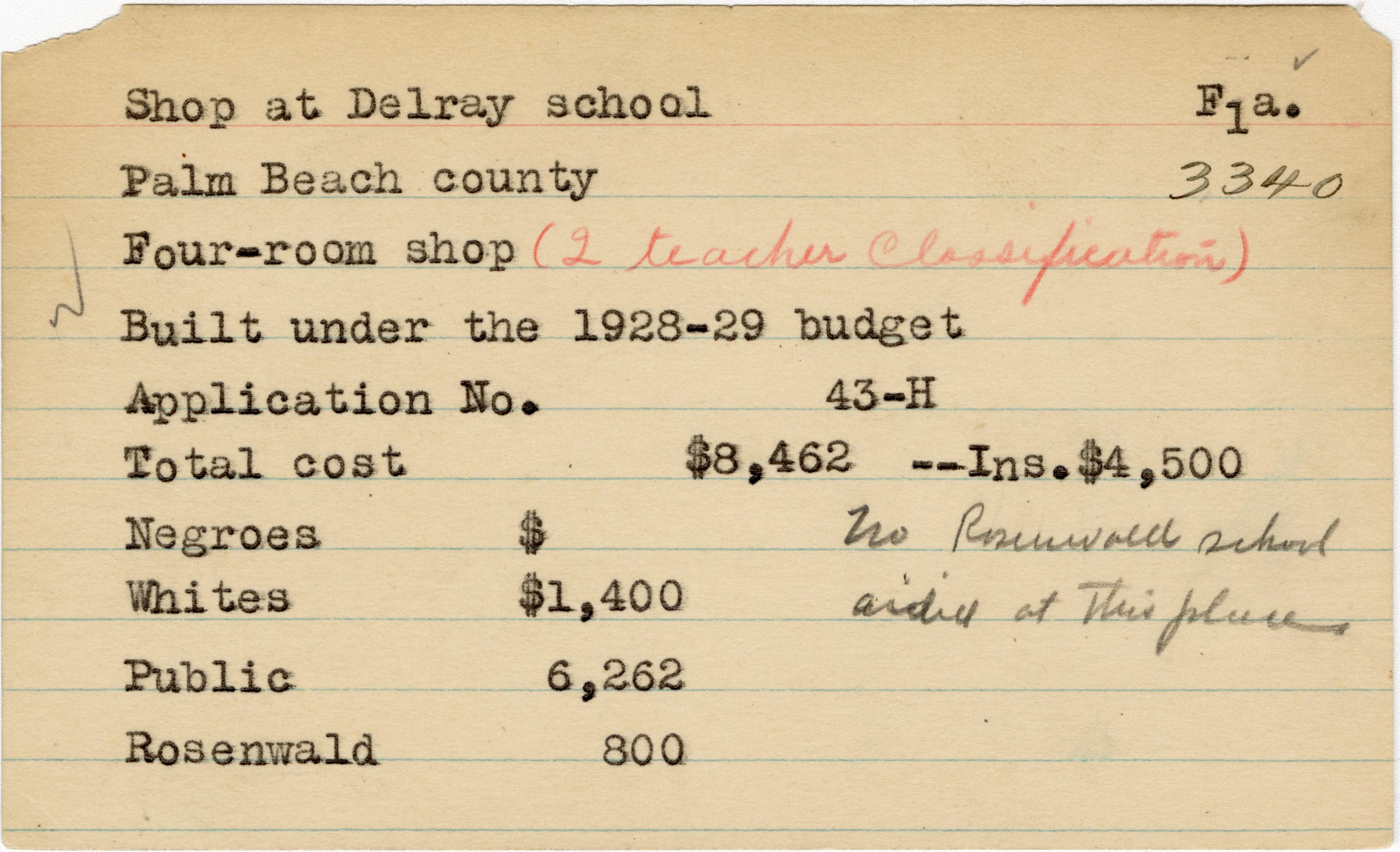 - School card from the Rosenwald Fund for the four-room shop at Delray School in Palm Beach County, Florida with a section added to the budget contributions that says, "Ins. $4,500" and a handwritten note that says "No Rosenwald school aided at this place".