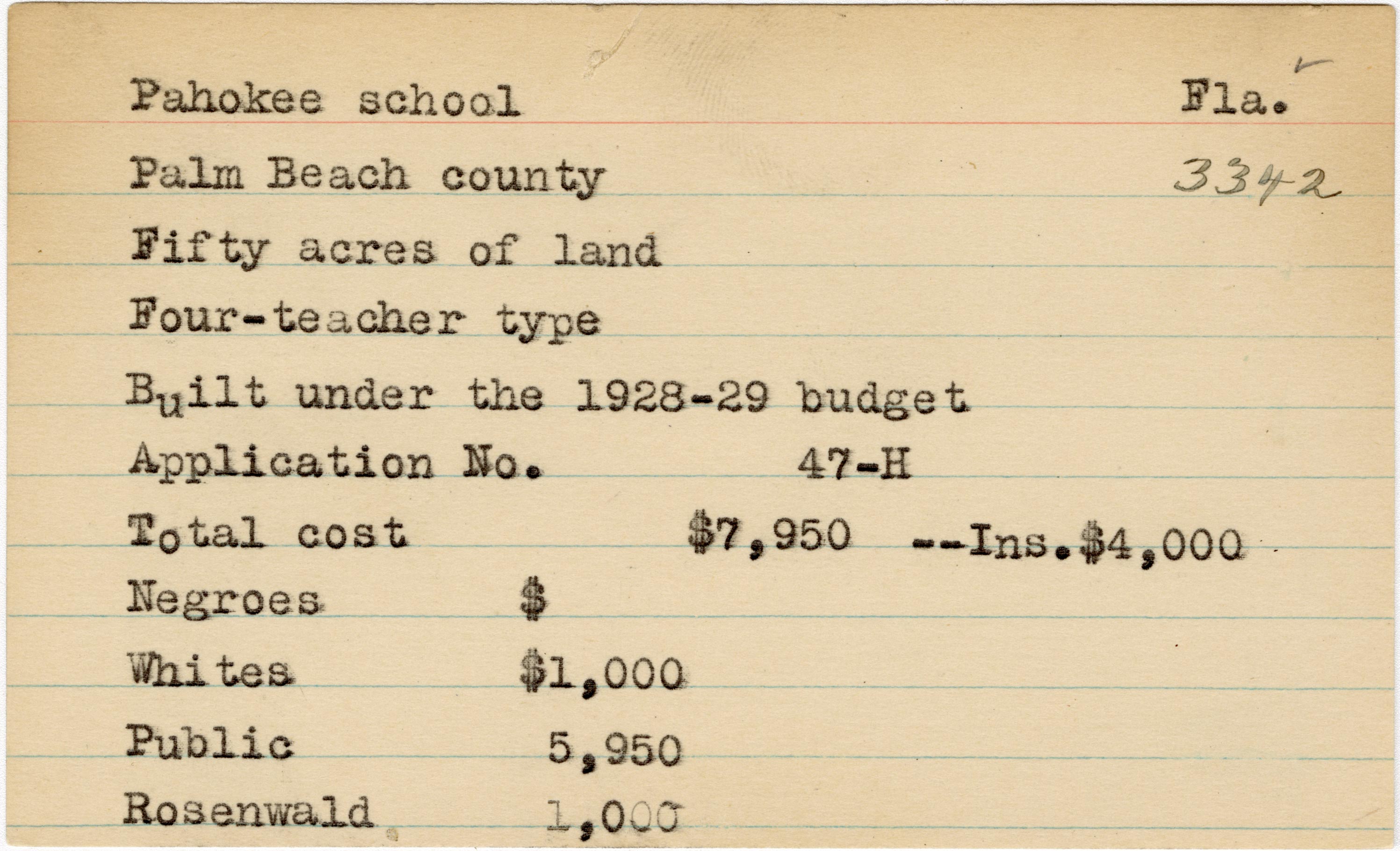 - School card from the Rosenwald Fund for Pahokee School in Palm Beach County, Florida with a section added to the budget contributions that says, "Ins. $4,000"