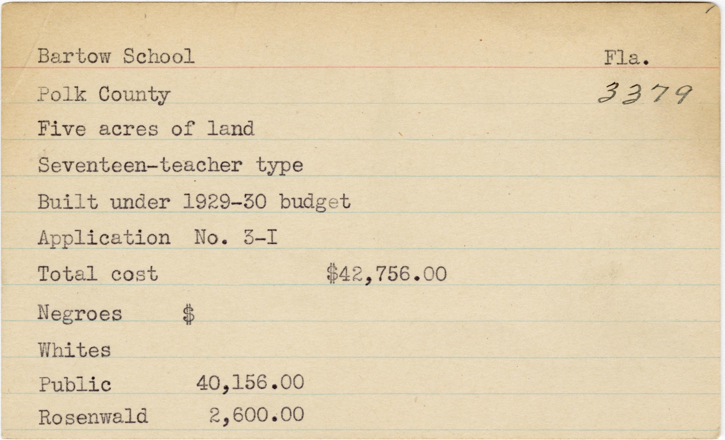 - School card from the Rosenwald Fund for Bartow School in Polk County, Florida