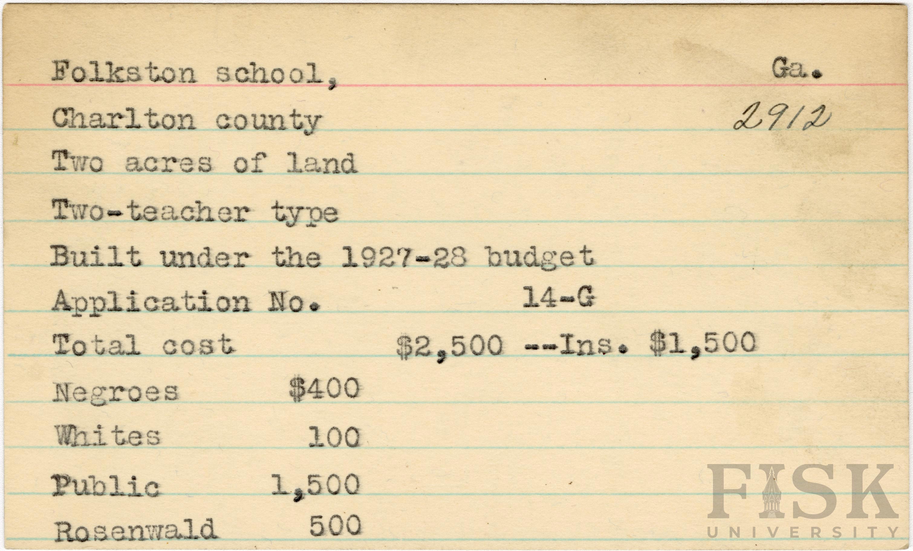 School card from Rosenwald Fund for Folkston School in Charlton County, Georgia with a section added to the budget contributions that says, "Ins. $1,500"