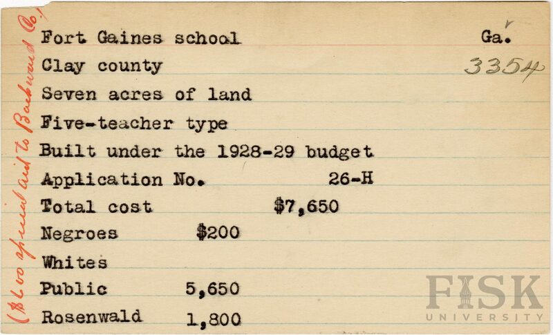 - School card from Rosenwald Fund for Fort Gaines School in Clay County, Georgia with a handwritten note on the far left that says, "($600 special aid to Backward Co.)"