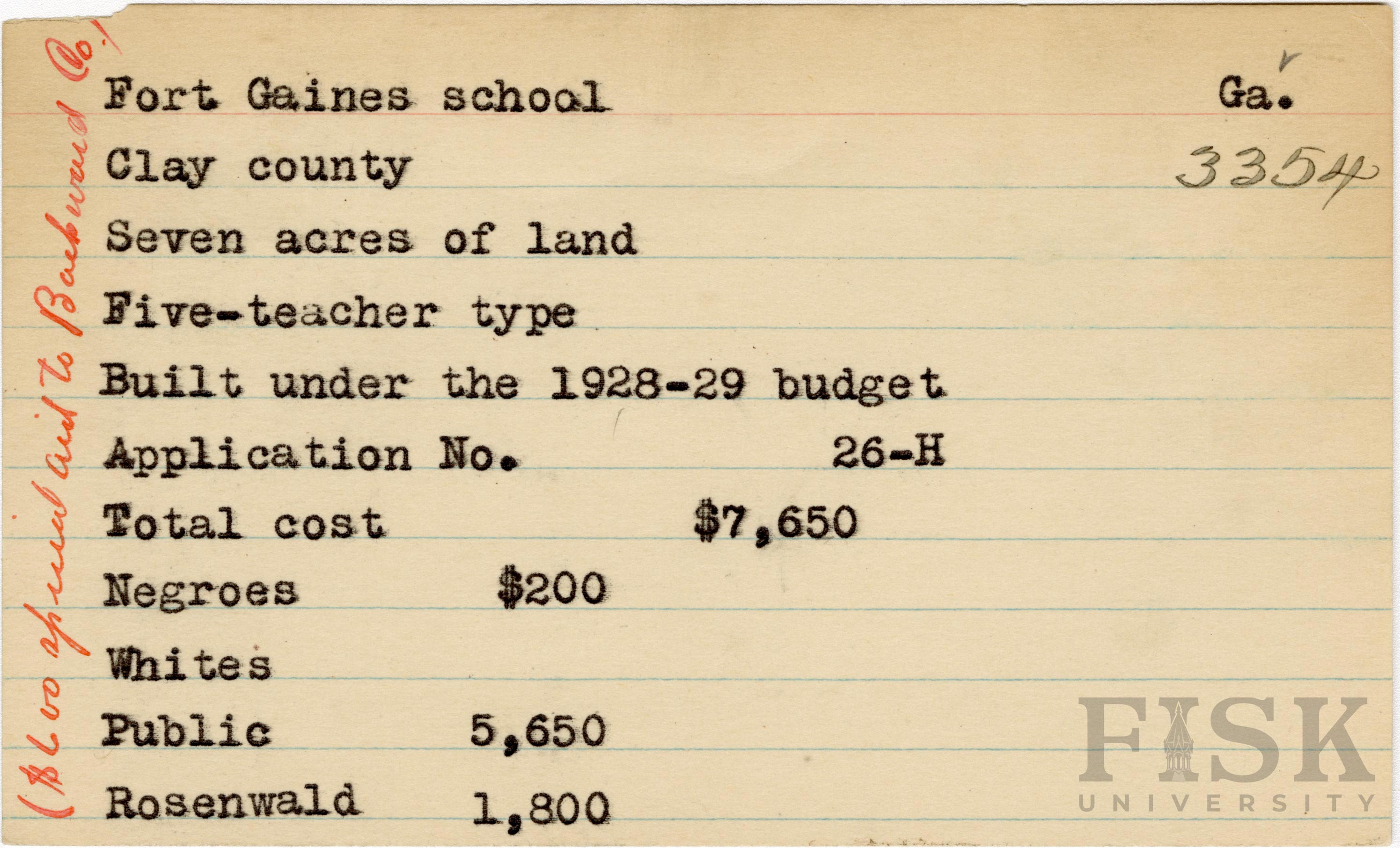 School card from Rosenwald Fund for Fort Gaines School in Clay County, Georgia with a handwritten note on the far left that says, "($600 special aid to Backward Co.)"