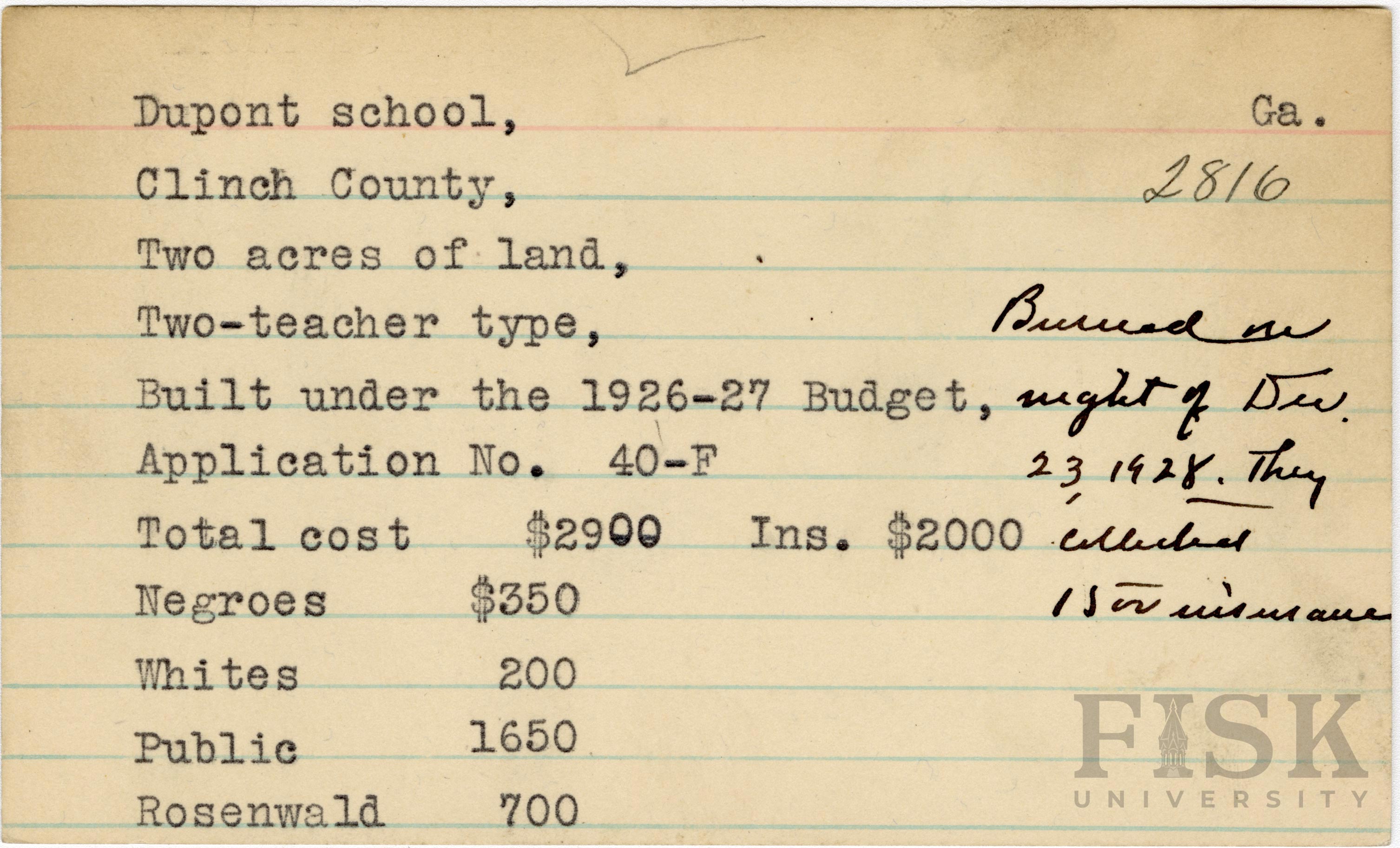 School card from Rosenwald Fund for Dupont School in Clinch County, Georgia with a handwritten note that says, "Burned on night of Dec. 23, 1928. They collected $1,500 insurance."