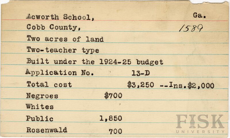 - Julius Rosenwald Fund--Buildings, African American schools--History--20th century, African American schools -- Acworth School