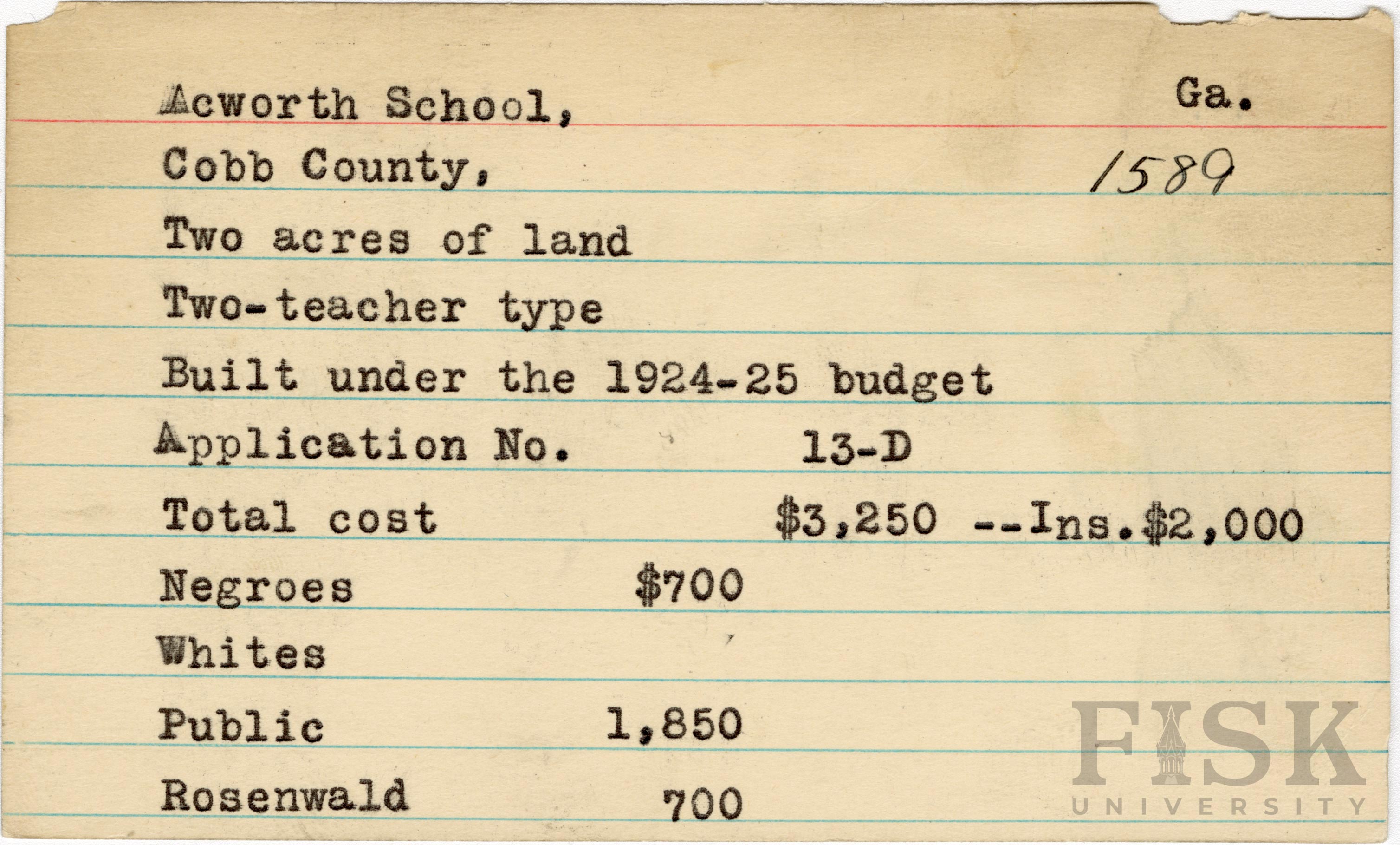 - School card from Rosenwald Fund for Acworth School in Cobb County, Georgia with a section added to the budget contributions that says, "Ins. $2,000"