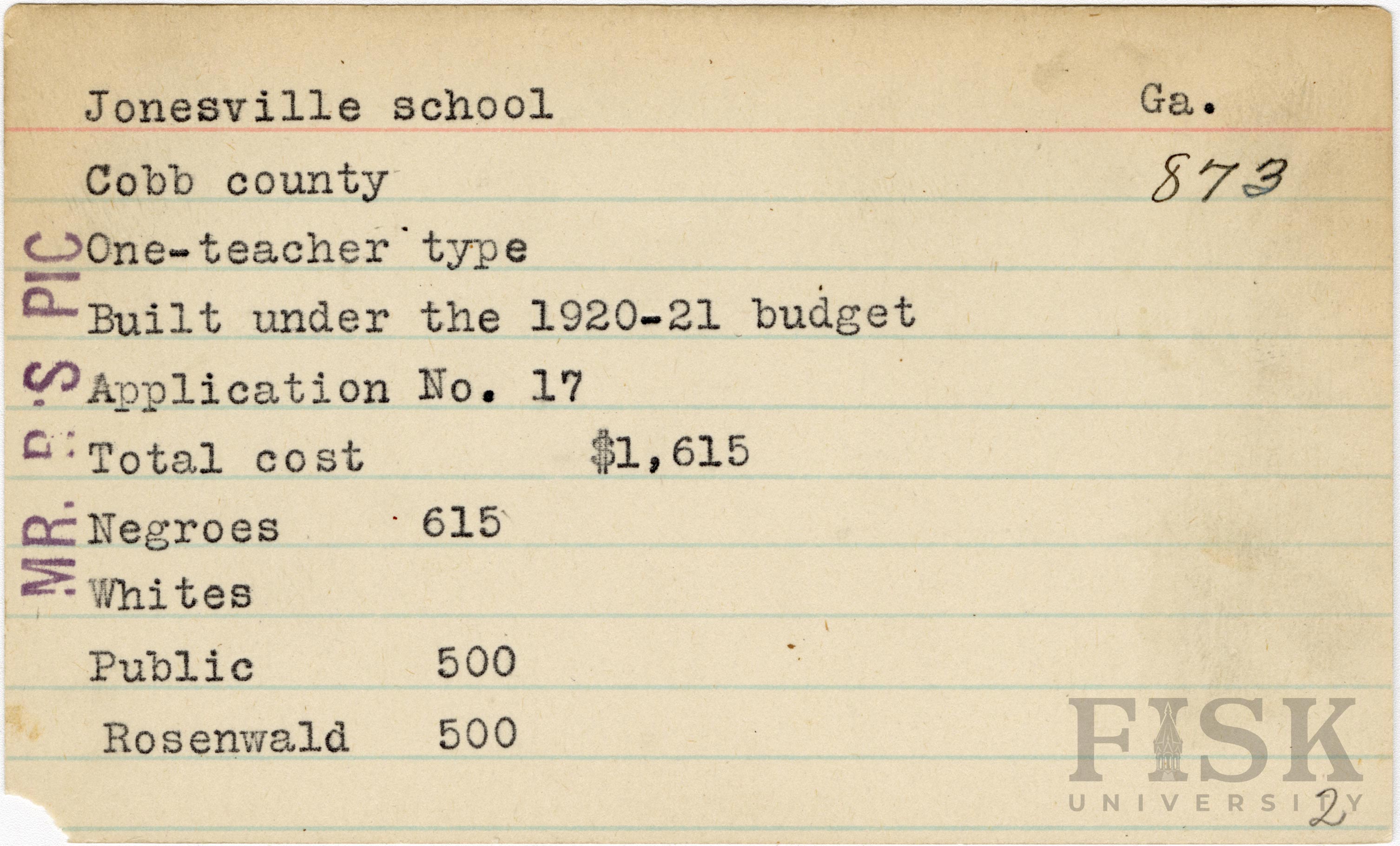 - School card from Rosenwald Fund for Jonesville School in Cobb County, Georgia with a note on the far left of the card that says, "Mr. R's Pic"