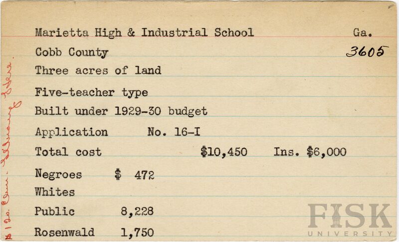 School card from Rosenwald Fund for Marietta High & Industrial School in Cobb County, Georgia with a section added to the budget contributions that says, "Ins. $6,000" and a handwritten note on the far left of the card that says, "$120 elem. Library here"