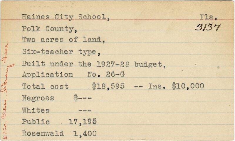 - School card from the Rosenwald Fund for Haines City School in Polk County, Florida with a section added to the budget contributions that says, "Ins. $10,000" and a handwritten note on the far left that says, "$120 elem library here"