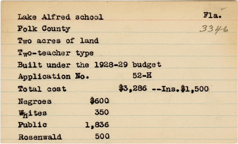 - Julius Rosenwald Fund--Buildings, African American schools--History--20th century, African American schools -- Lake Alfred School