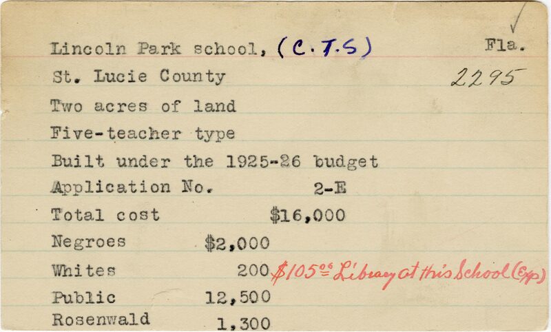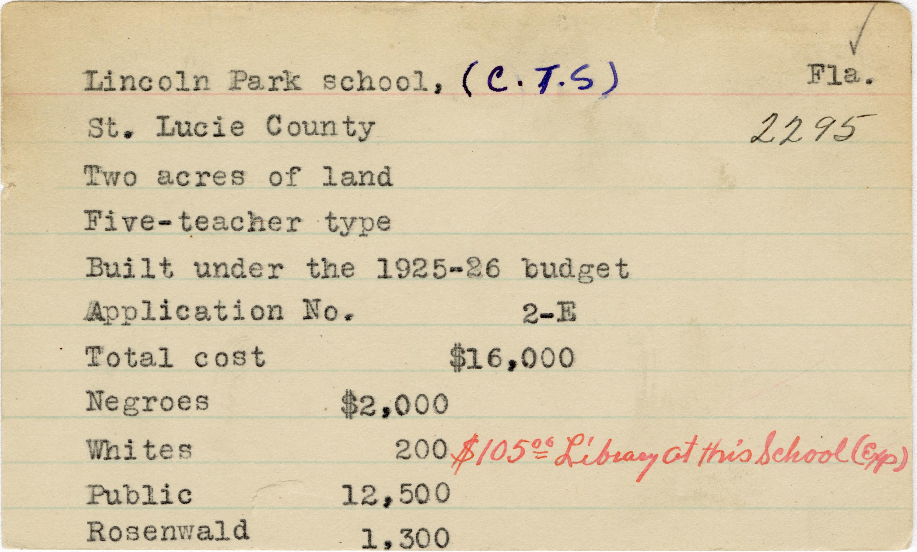 - School card from the Rosenwald Fund for Lincoln Park School in St. Lucie County, Florida with a handwritten note added that says, "$105.00 library at this school (Exp)"