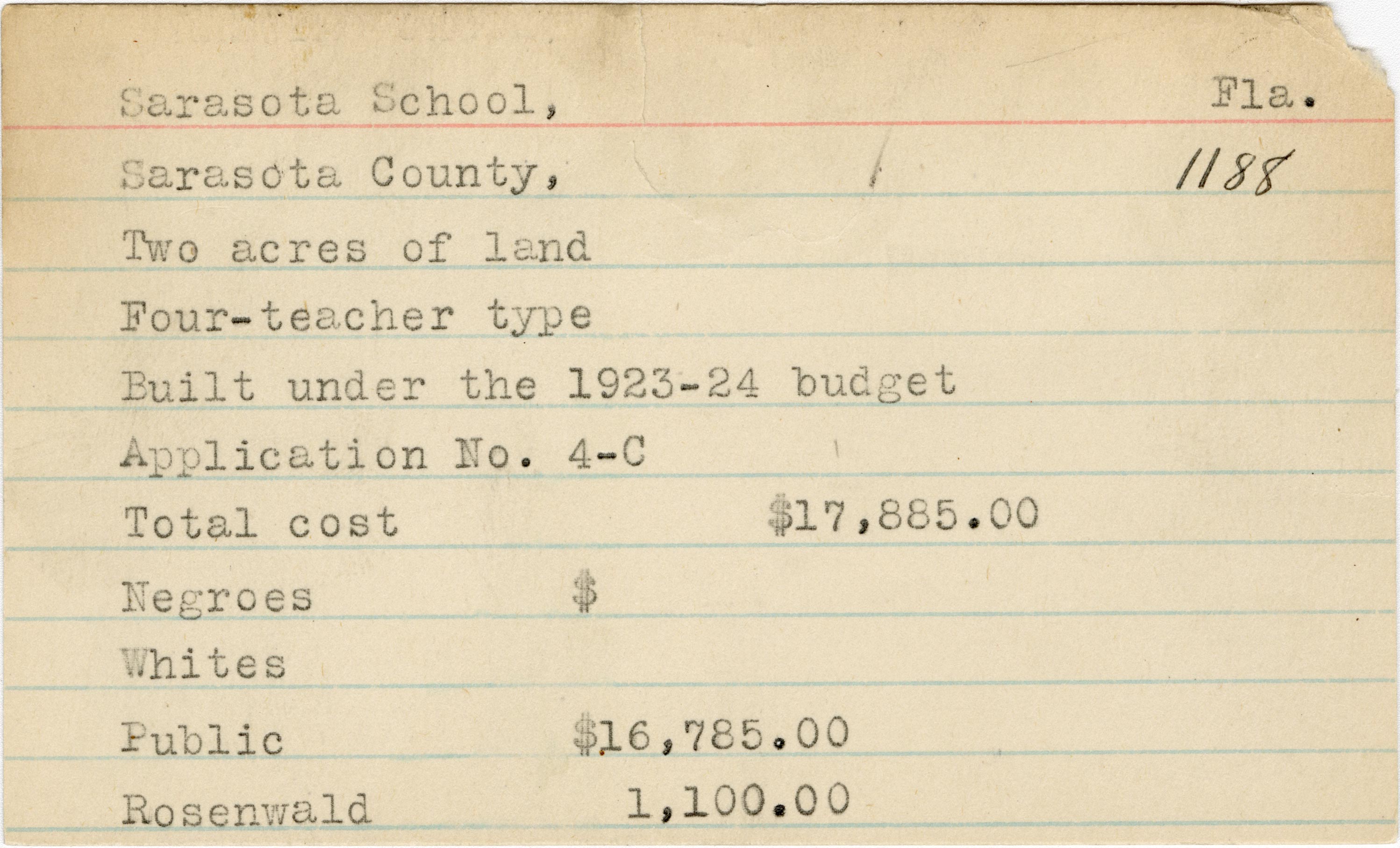 School card from the Rosenwald Fund for Sarasota School in Sarasota County, Florida