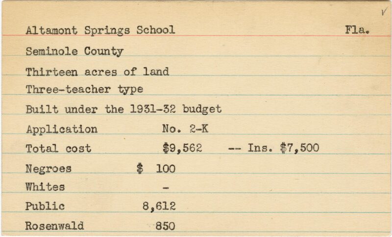 - School card from the Rosenwald Fund for Altamont Springs School in Seminole County, Florida with a section added to the budget contributions that says, "Ins. $7,500"