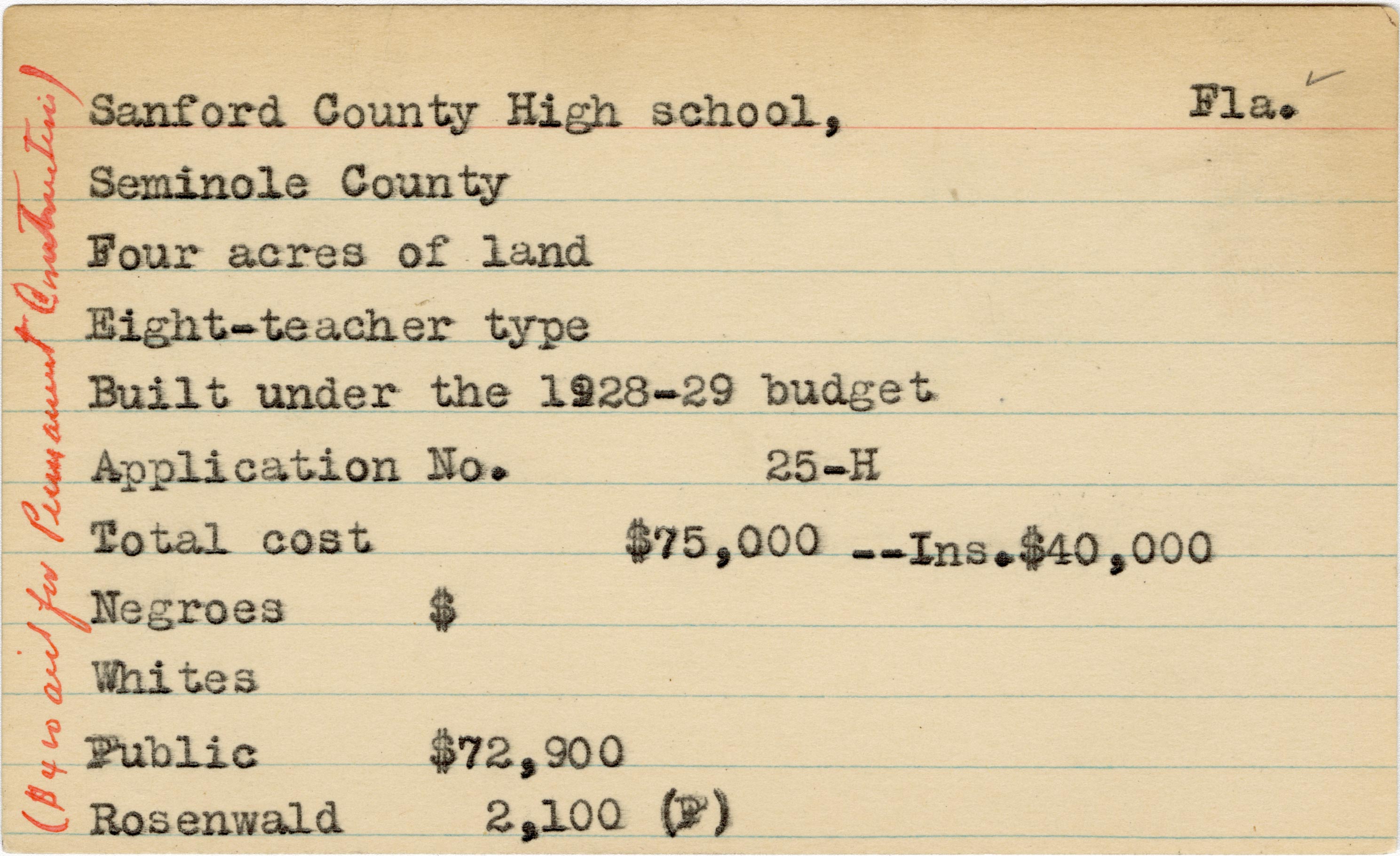 School card from the Rosenwald Fund for Sanford County High School in Seminole County, Florida with a section added to the budget contributions that says, "Ins. $40,000" and a handwritten note on the far left side of the card that says, "($420 aid for permanent instruction)"