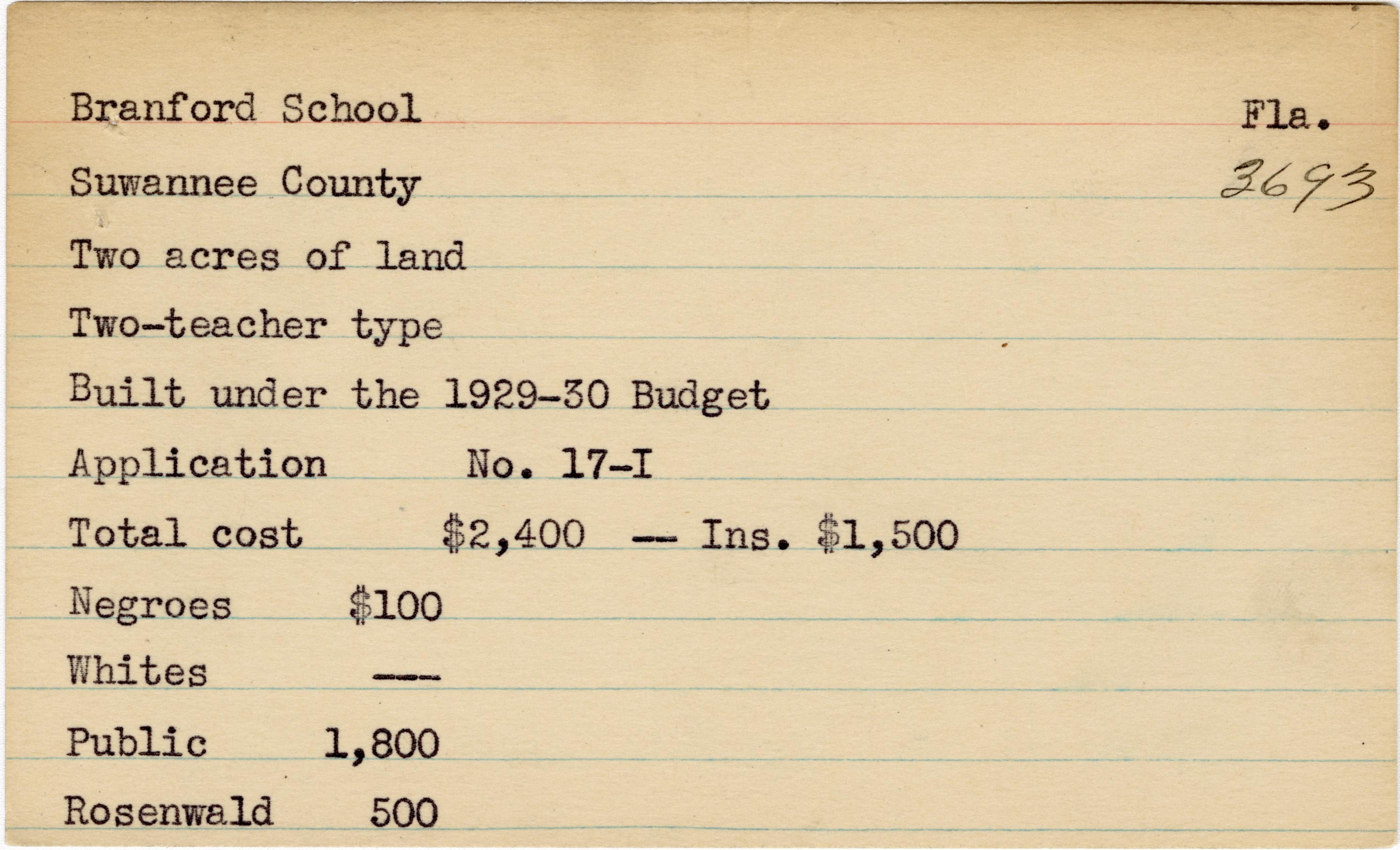School card from the Rosenwald Fund for Branford School in Suwannee County, Florida with a section added to the budget contributions that says, "Ins. $1,500"