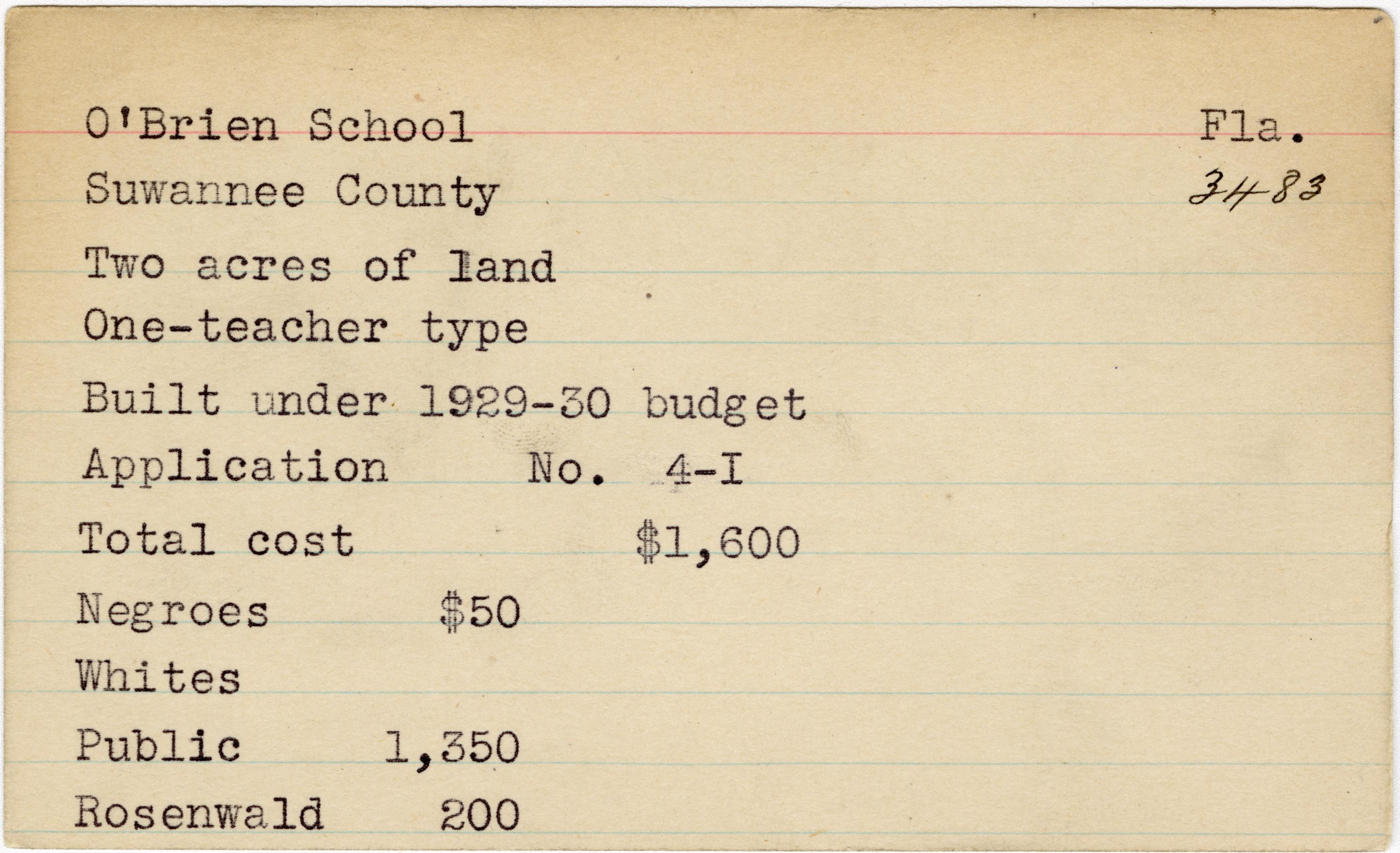 - School card from the Rosenwald Fund for O'Brien School in Suwannee County, Florida