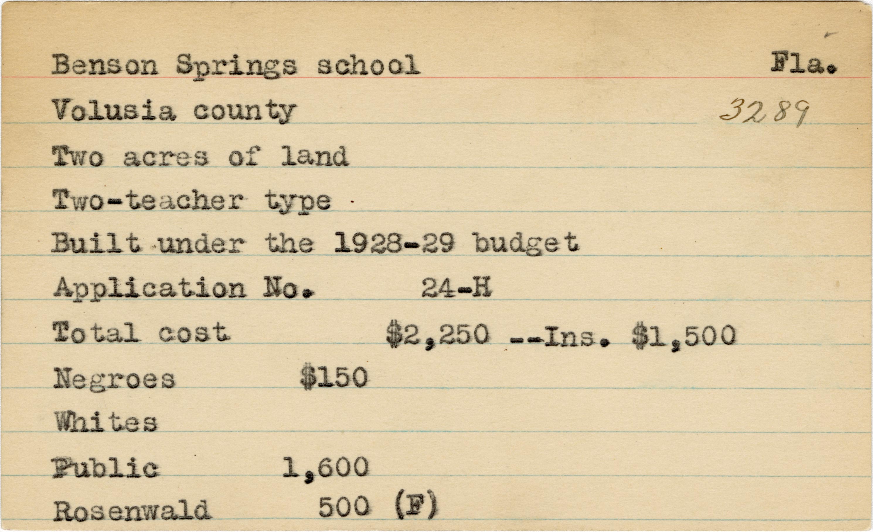 - School card from the Rosenwald Fund for Benson Springs School in Volusia County, Florida with a section added to the budget contributions that says, "Ins. $1,500"