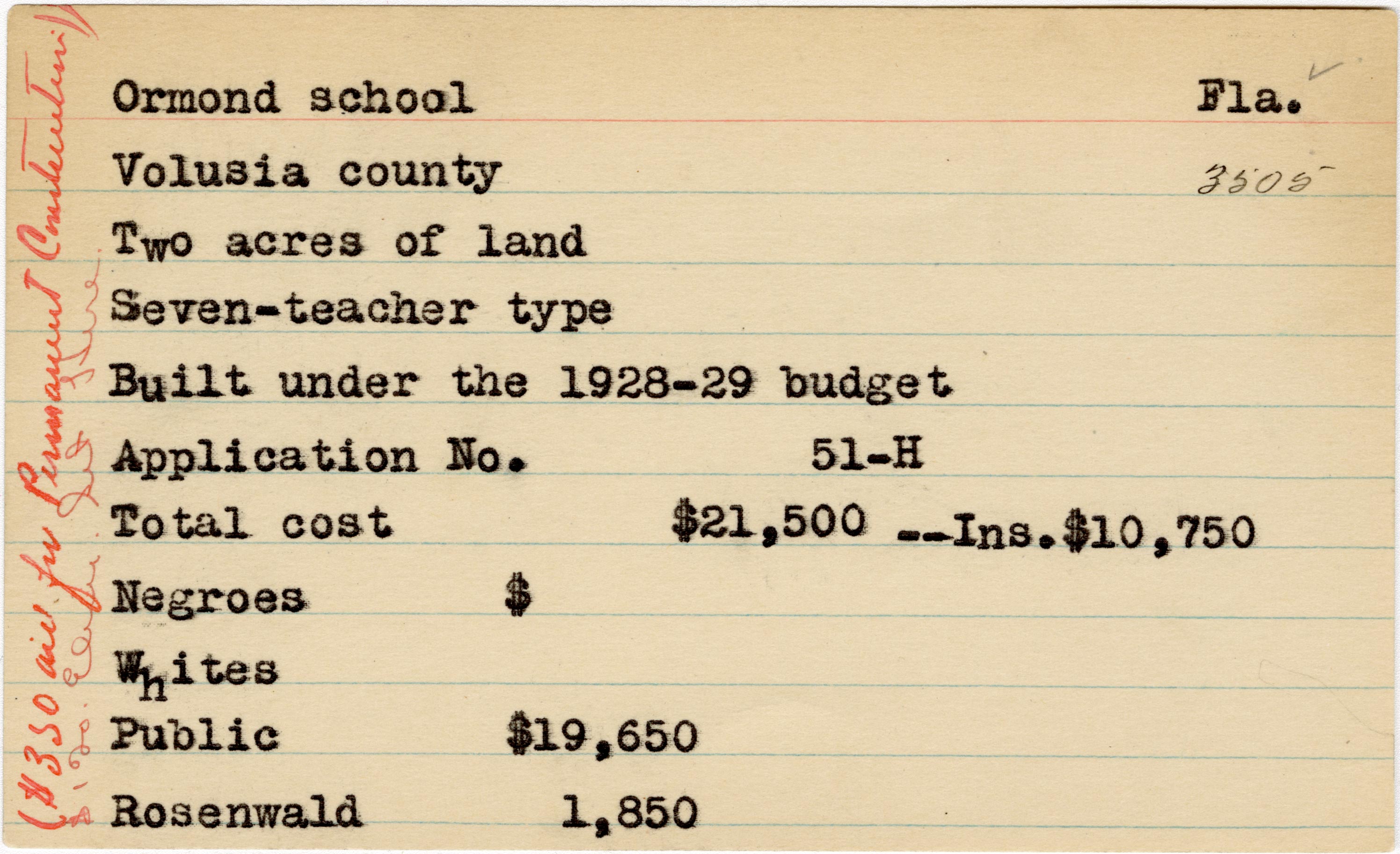 School card from the Rosenwald Fund for Ormond School in Volusia County, Florida with a section added to the budget contributions that says, "Ins. $10,750" and handwritten notes on the far left of the card that say, "($350 aid for permanent instruction)" and "$120 elem lib here"
