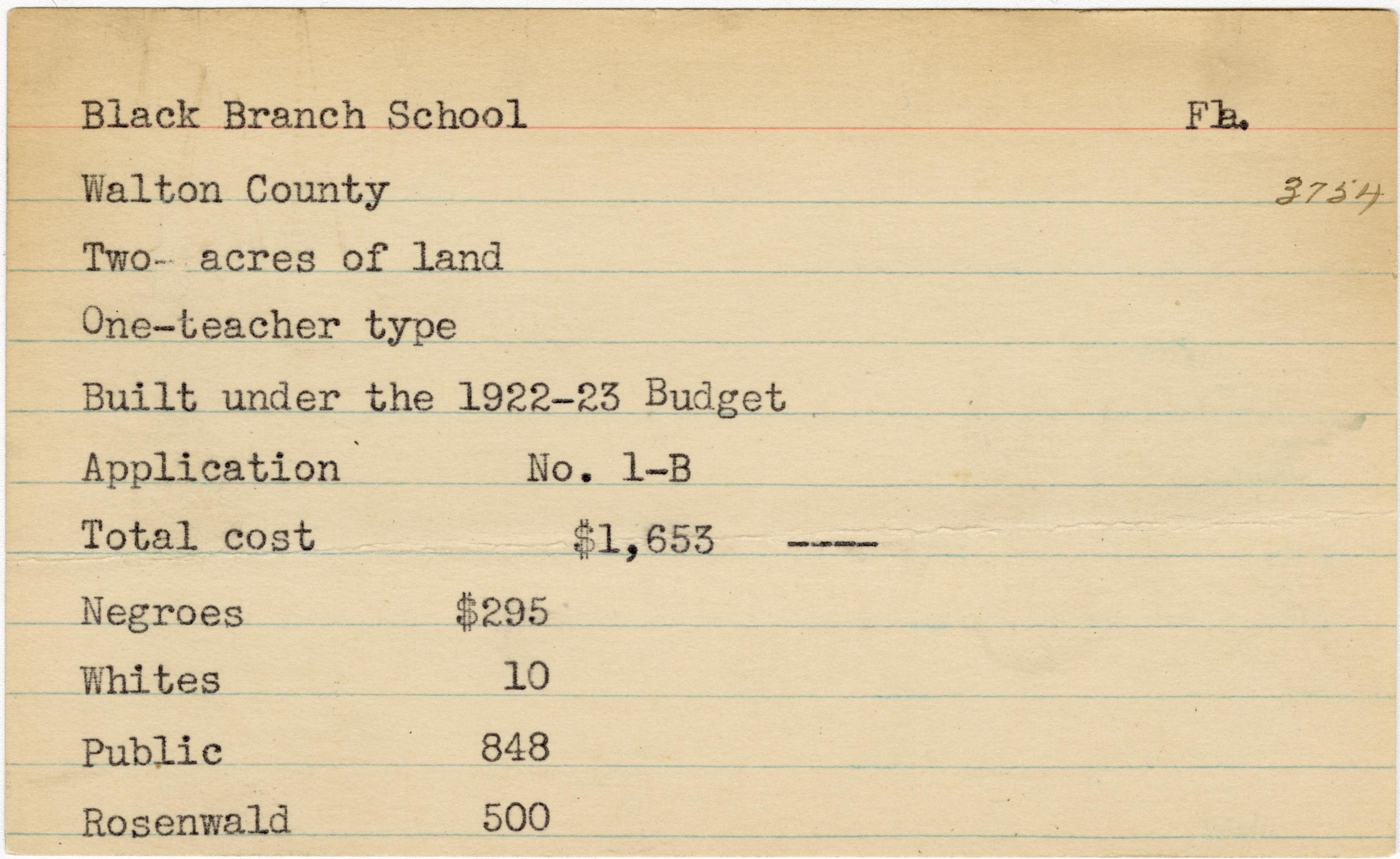 - School card from the Rosenwald Fund for Black Branch School in Walton County, Florida