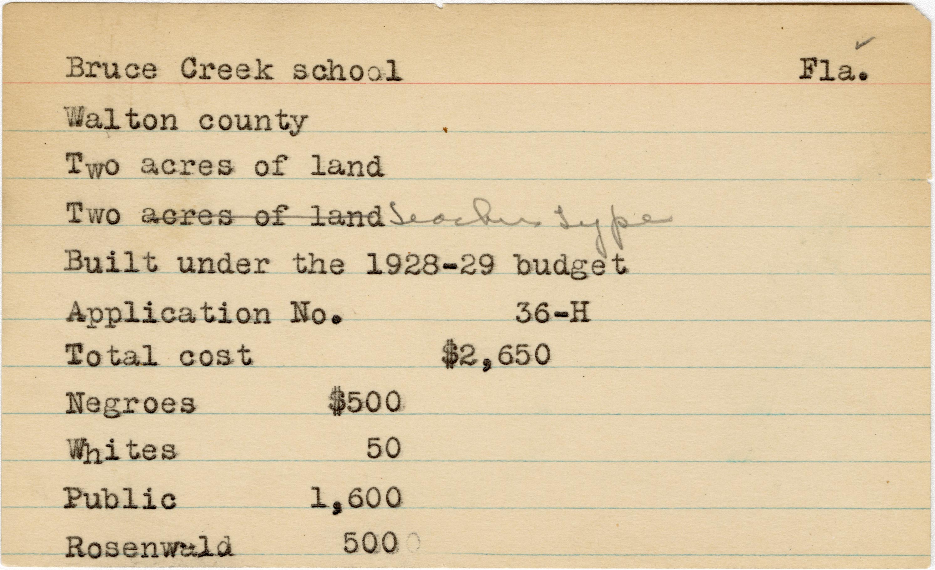 - School card from the Rosenwald Fund for Bruce Creek School in Walton County, Florida