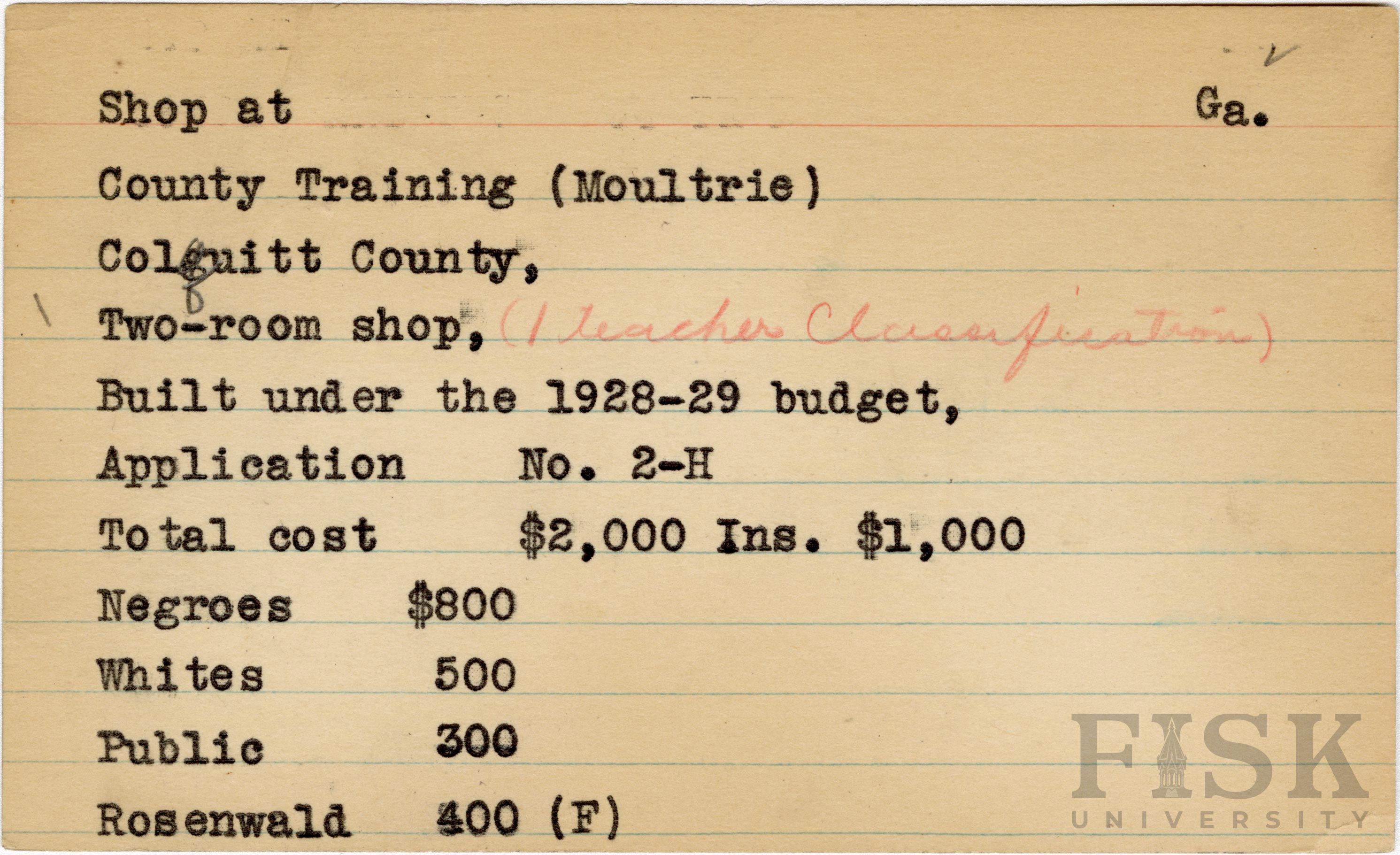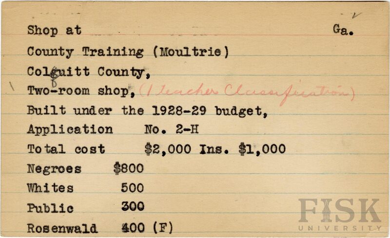 - School card from Rosenwald Fund for the two-room shop at County Training School in Colquitt County, Georgia with a section added to the budget contributions that says, "Ins. $1,000"