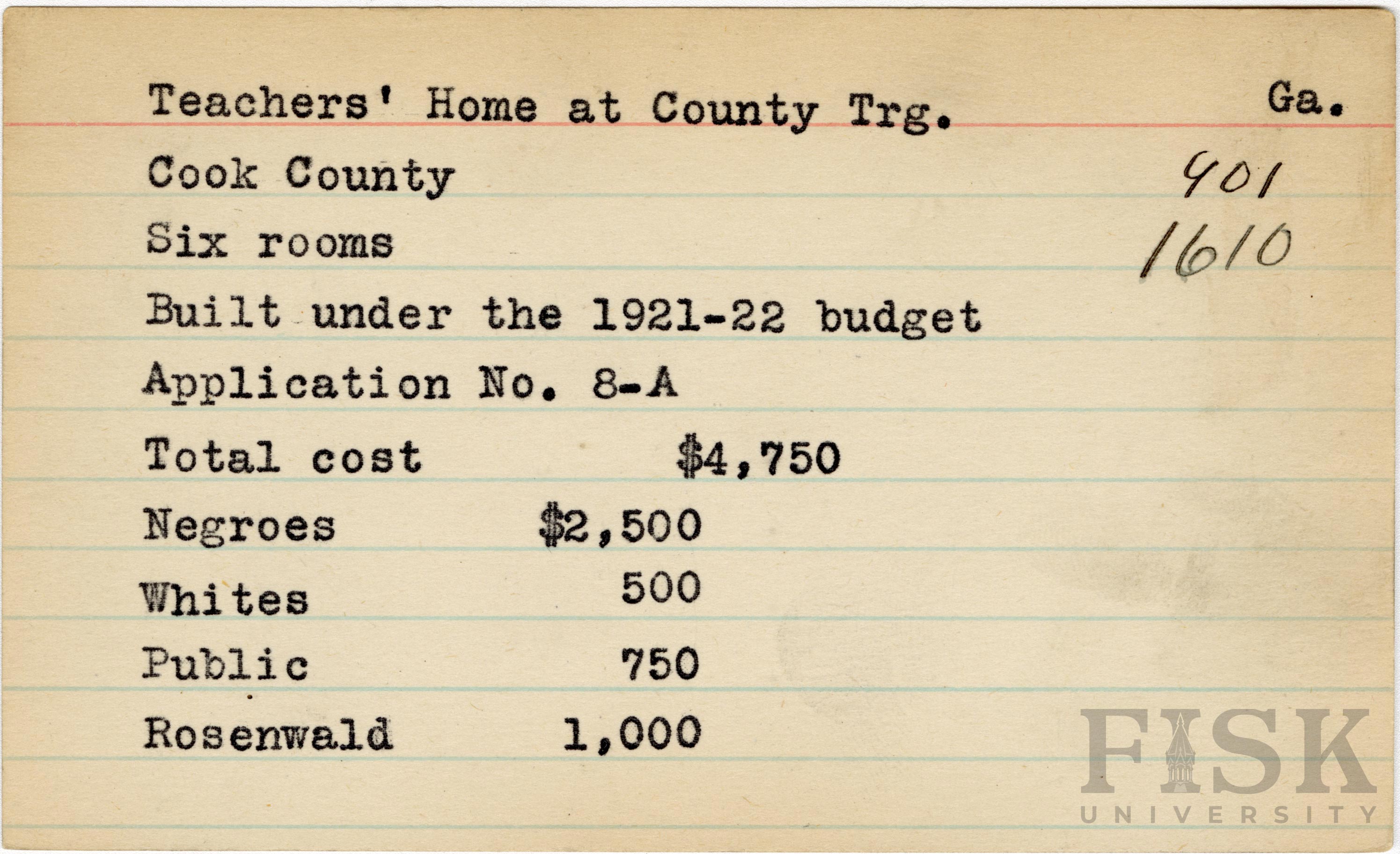 - School card from Rosenwald Fund for the six-room teacher's home at Adel School in Cook County, Georgia