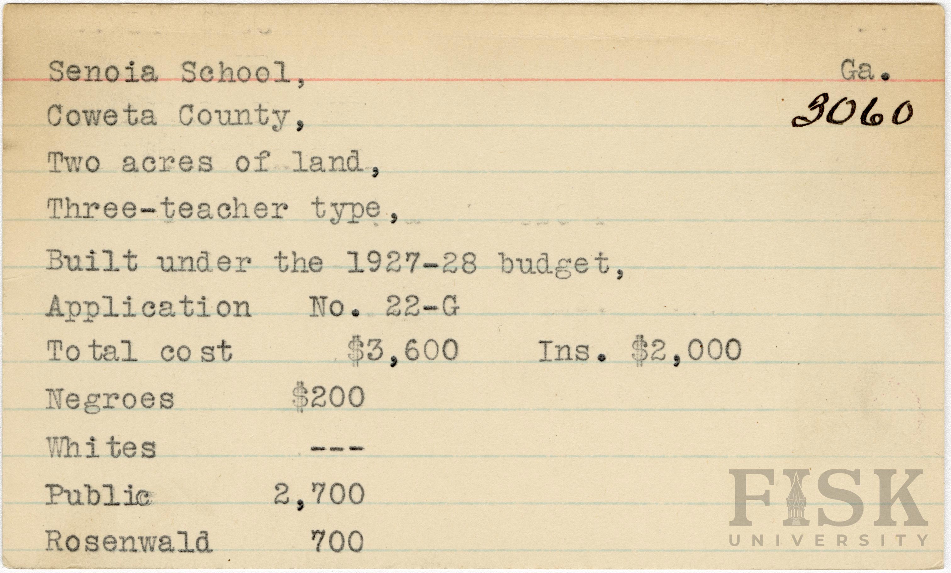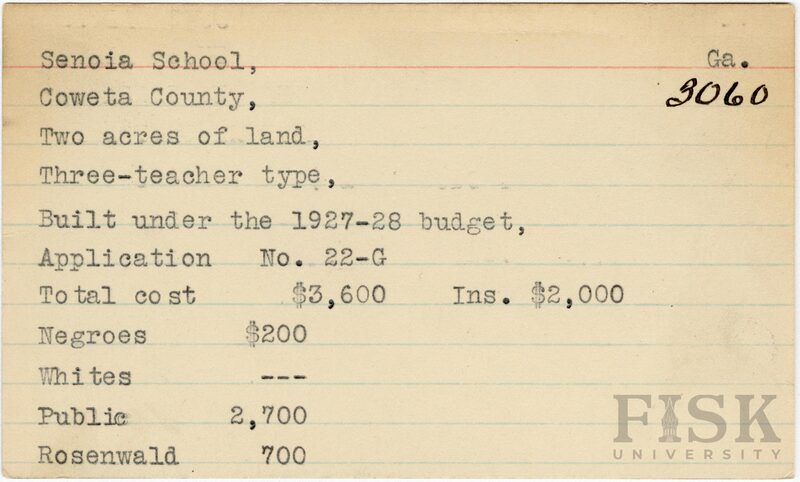 School card from Rosenwald Fund for Senoia School in Coweta County, Georgia with a section added to the budget contributions that says, "Ins. $2,000"