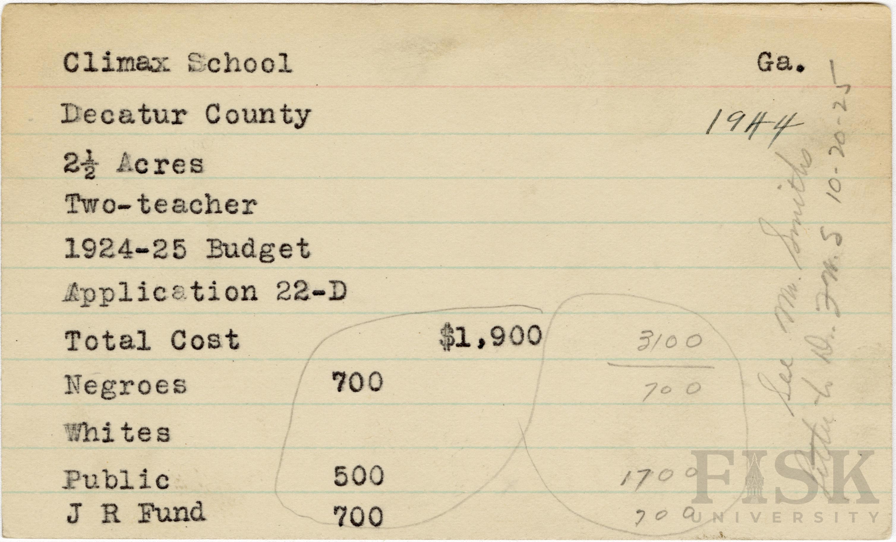 - School card from Rosenwald Fund for Climax School in Decatur County, Georgia with handwritten additions to the budget contribution sections and a handwritten note that says, "See Mr. Smiths letter to D. Fw. S 10-20-25"