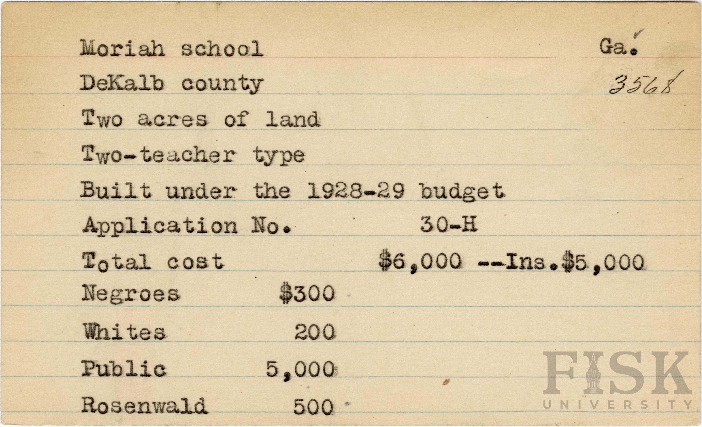 School card from Rosenwald Fund for Moriah School in DeKalb County, Georgia with a section added to the budget contributions that says, "Ins. $5,000"