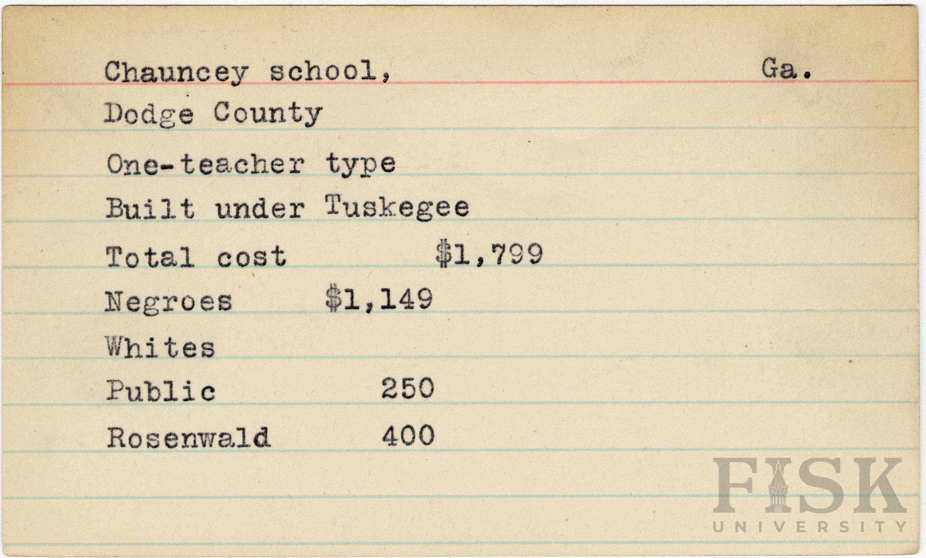 - School card from Rosenwald Fund for Chauncey School in Dodge County, Georgia