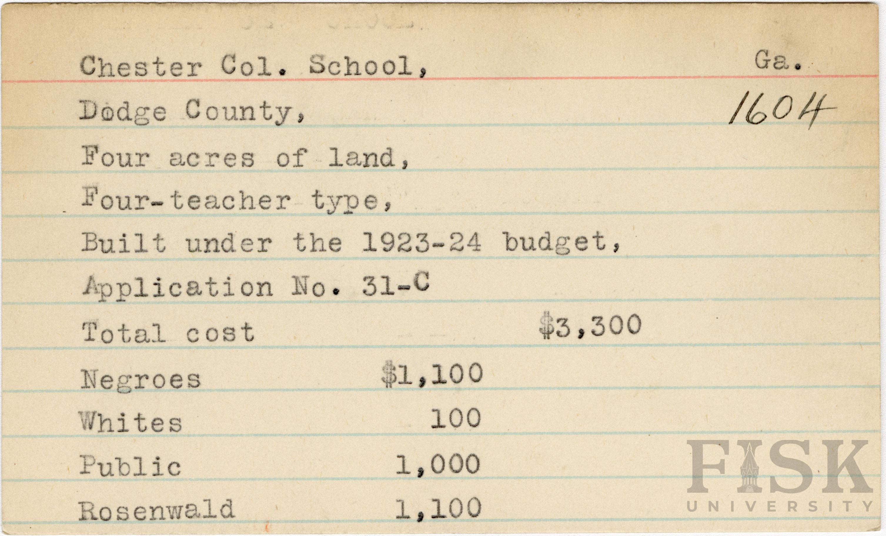 - School card from Rosenwald Fund for Chester Col. School in Dodge County, Georgia