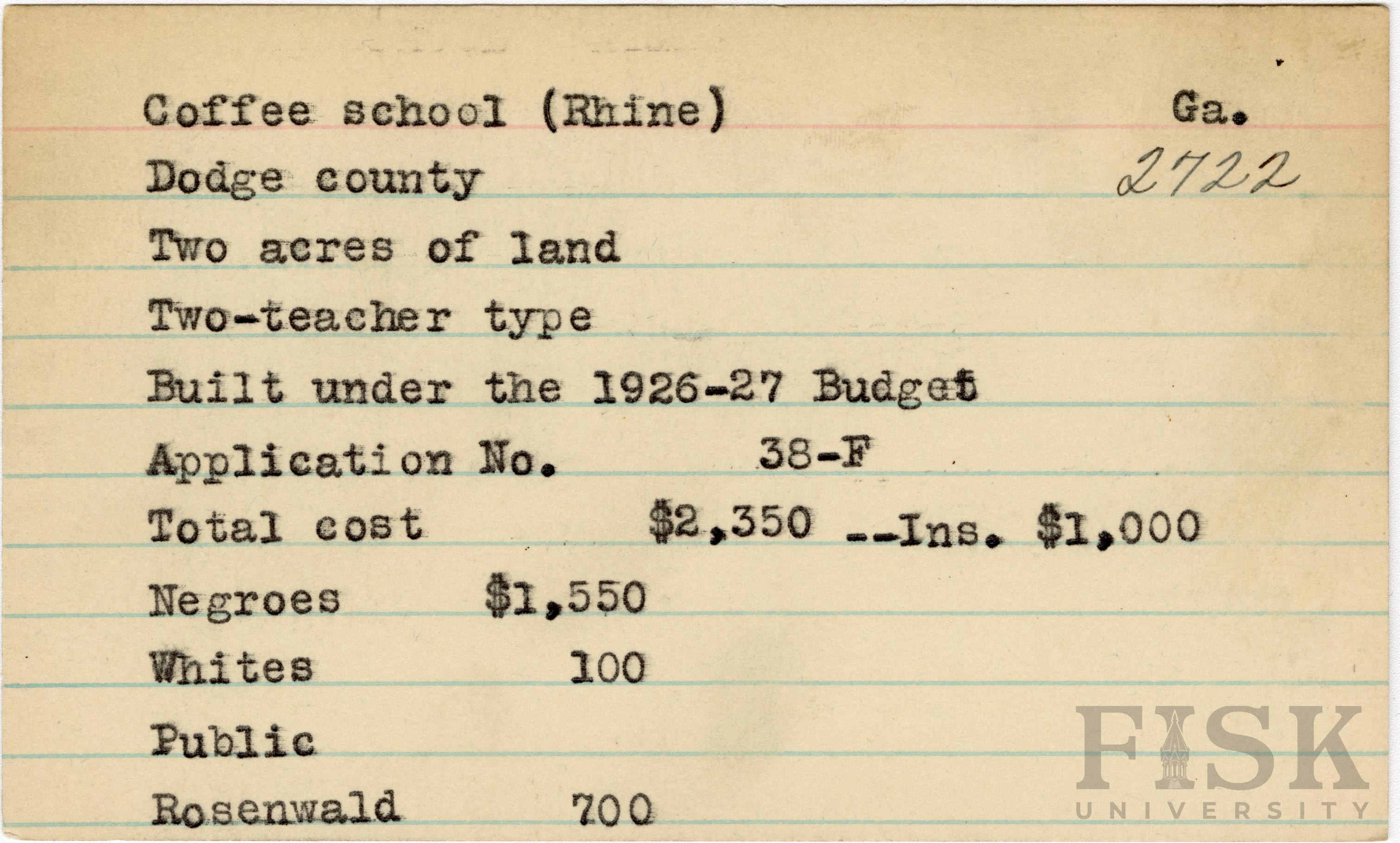 School card from Rosenwald Fund for Coffee School in Dodge County, Georgia with a section added to the budget contributions that says, "Ins. $1,000"