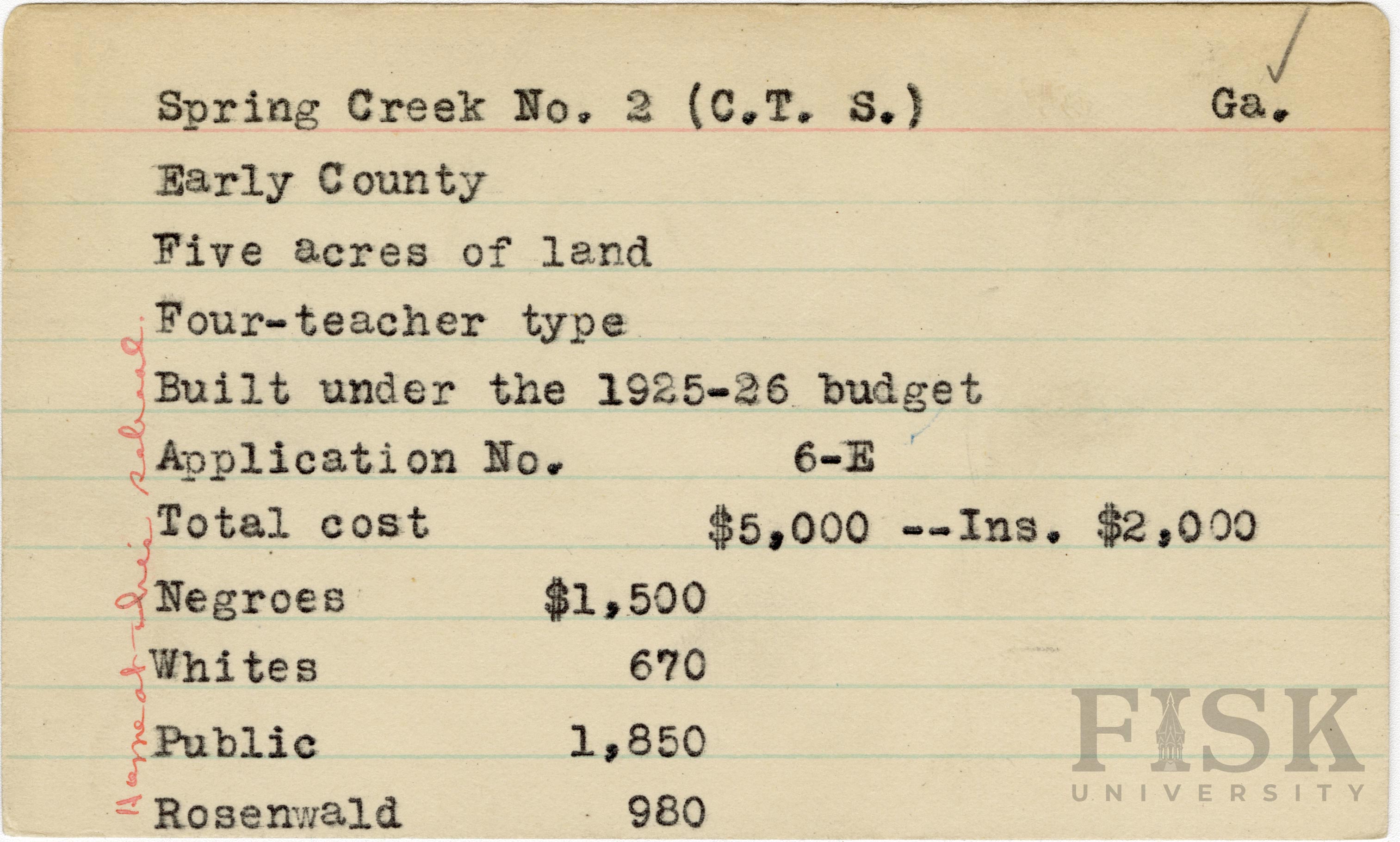 School card from Rosenwald Fund for Spring Creek No. 2 in Early County, Georgia with a section added to the budget contributions that says, "Ins. $2,000" and a handwritten note that says, "Home at this school"