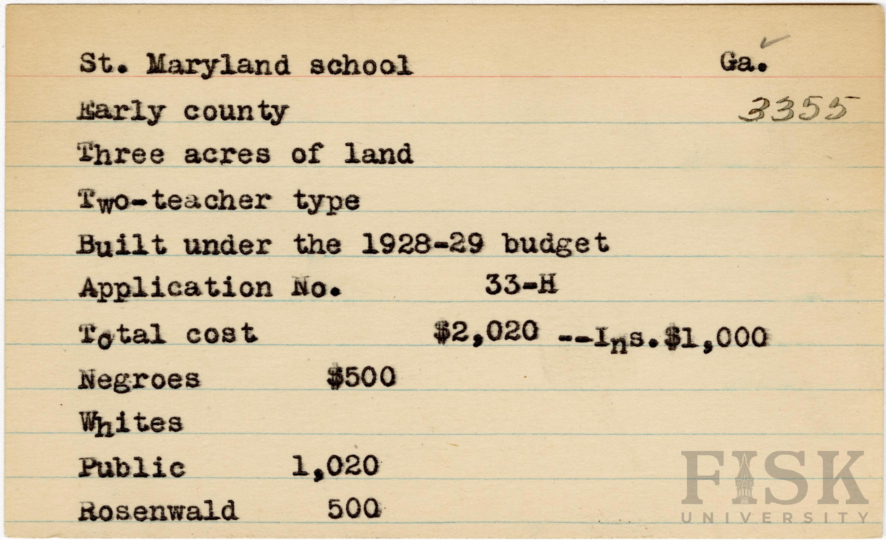 - School card from Rosenwald Fund for St. Maryland School in Early County, Georgia with a section added to the budget contributions that says, "Ins $1,000"