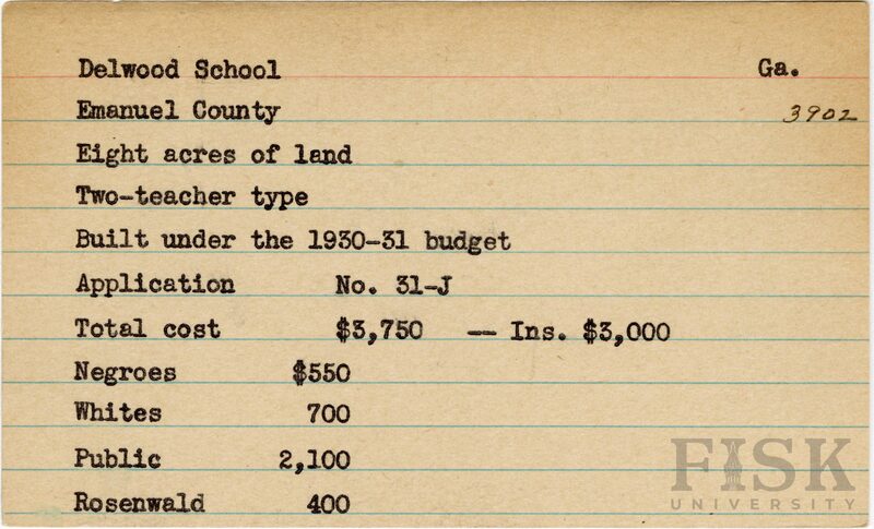 School card from Rosenwald Fund for Delwood School in Emanuel County, Georgia with a section added to the budget contributions that says, "Ins. $3,000"